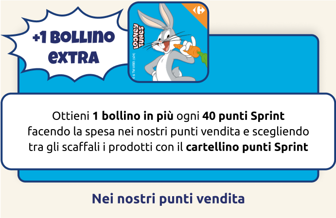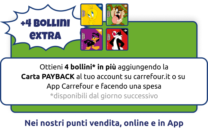Solo con Carta PAYBACK, ogni 20€ di spesa nei Carrefour Iper e Market, 15€ nei Carrefour Express e ogni 35€ su carrefour.it o App Carrefour, ricevi un bollino della Collezione Looney Tunes.