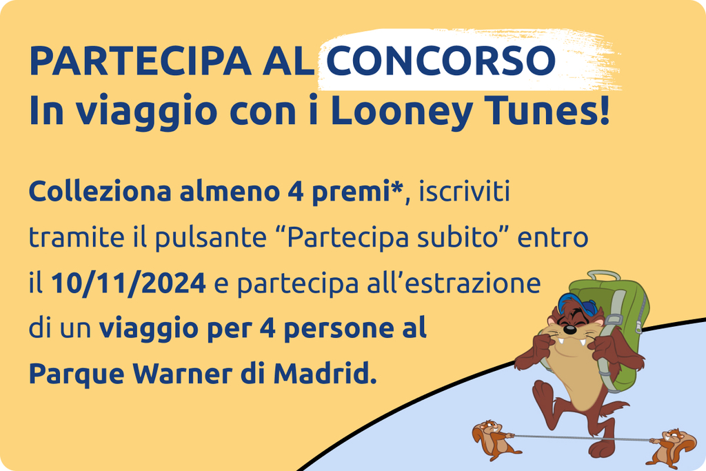 Una nuova Collezione Looney Tunes Carrefour 2024 ti aspetta! Fai la spesa nei punti vendita Carrefour o fai la Spesa Online e colleziona i fantastici premi Looney Tunes. Raccogli i bollini e riscatta il premio che preferisci: i pupazzi dei personaggi Looney Tunes, astuccio, zaino e tanti altri! Non perderti inoltre il concorso "In viaggio con i Looney Tunes": puoi vincere un viaggio al Parque Warner di Madrid! Ti aspettiamo in negozio o online su carrefour.it.
