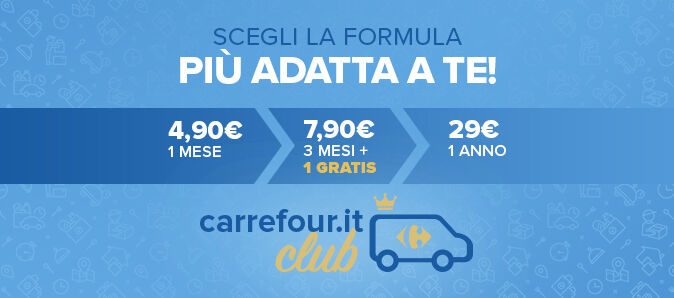 Scopri le due tipologie di abbonamento a Carrefour Club e provalo gratuitamente per 6 giorni! Per te spese di spedizione gratuite sulla tua spesa online di almeno 59 euro e 15% di sconto online sui prodotti Carrefour BIO, Terre d'Italia e Carrefour Selection.