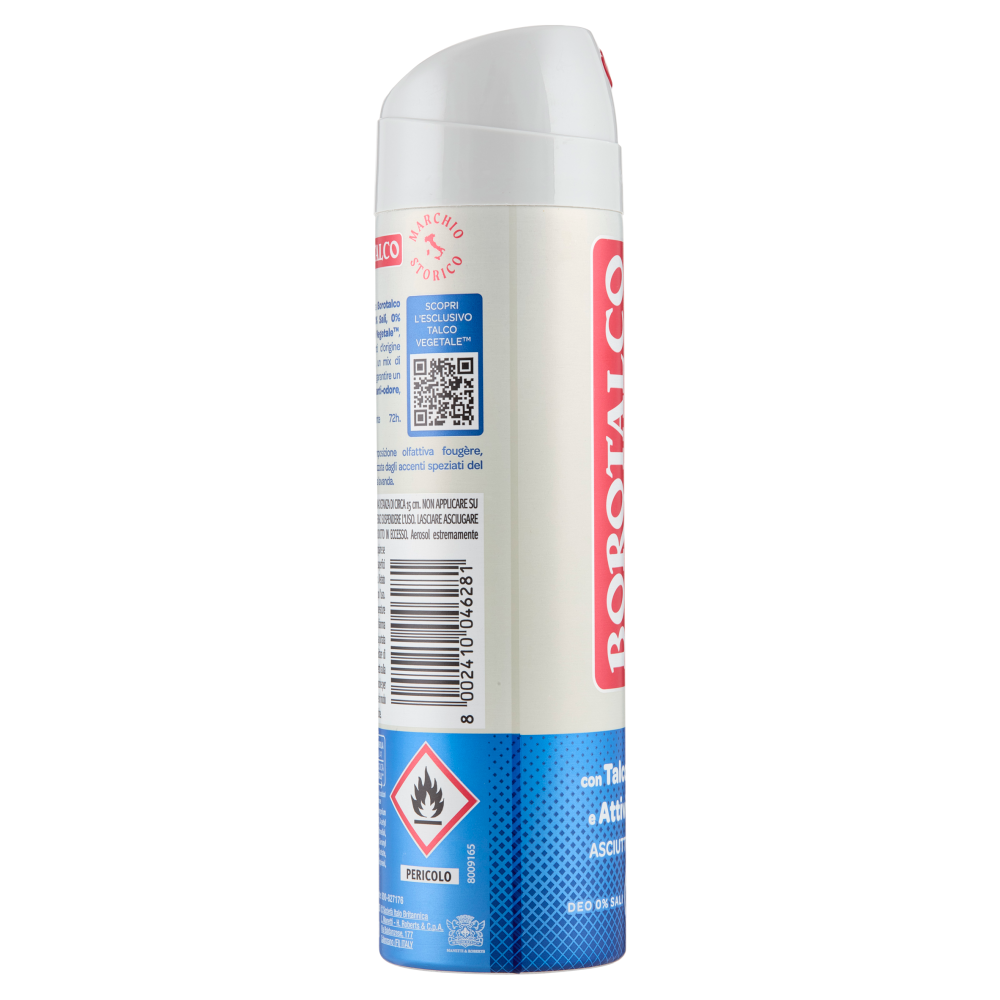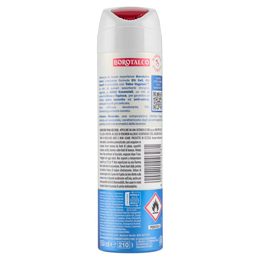 Abbraccia la nuova esperienza Borotalco Uomo! L'esclusiva formula 0% Sali, 0% Alcool* è arricchita con Talco Vegetale, un mix di polveri assorbenti d'origine vegetale, e Attivi Essenziali, un mix di polveri di Zinco e Tapioca, per garantire un effetto extra asciutto ed anti-odore, anche per le pelli più delicate. Extra efficacia deodorante 72h. Dermatologicamente testato. *ACH-Sali di Alluminio Cloridrato; Alcool Etilico Profumo Minerale: una composizione olfattiva fougère, delicata ed essenziale, caratterizzata dagli accenti speziati del garofano e da toni aromatici della lavanda.