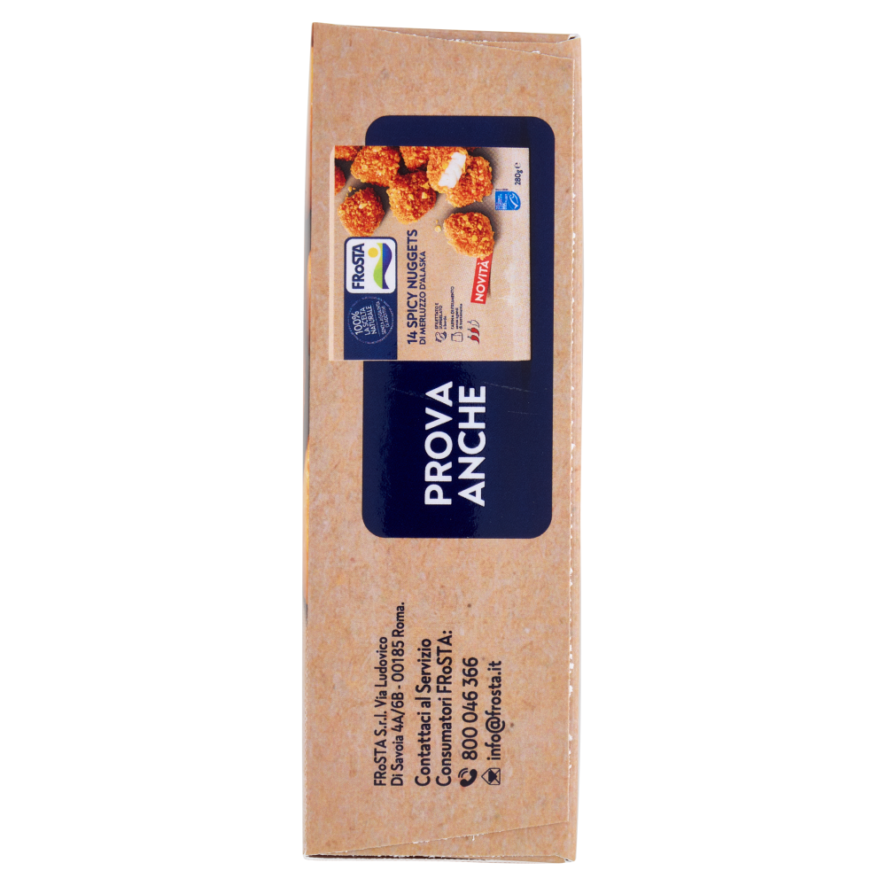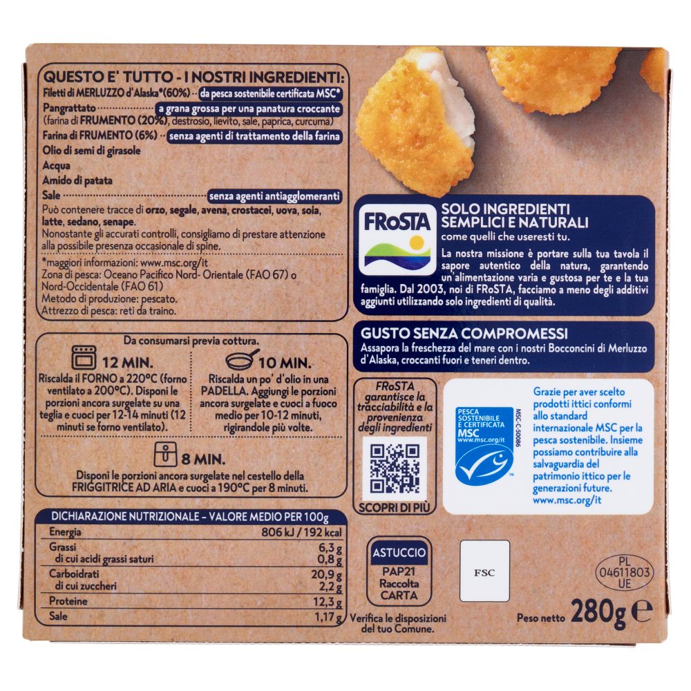 Questo è tutto - I nostri ingredienti: Filetti di Merluzzo d'Alaska (60%) - da pesca sostenibile certificata MSC* Pangrattato - a grana grossa per una panatura croccante (farina di Frumento (20%), destrosio, lievito, sale, paprica, curcuma) Farina di Frumento (6%) - senza agenti di trattamento della farina Olio di semi di girasole Acqua Amido di patata Sale - senza agenti antiagglomeranti Può contenere tracce di orzo, segale, avena, crostacei, uova, soia, latte, sedano, senape. *maggiori informazioni: www.msc.org/it Zona di pesca: Oceano Pacifico Nord-Orientale (FAO 67) o Nord-Occidentale (FAO 61) Metodo di produzione: pescato. Attrezzo di pesca: reti da traino. FRoSTA - Solo Ingredienti Semplici e Naturali come quelli che useresti tu. La nostra missione è portare sulla tua tavola il sapore autentico della natura, garantendo un'alimentazione varia e gustosa per te e la tua famiglia. Dal 2003, noi di FRoSTA, facciamo a meno degli additivi aggiunti utilizzando solo ingredienti di qualità. Gusto senza compromessi Assapora la freschezza del mare con i nostri Bocconcini di Merluzzo d'Alaska, croccanti fuori e teneri dentro.