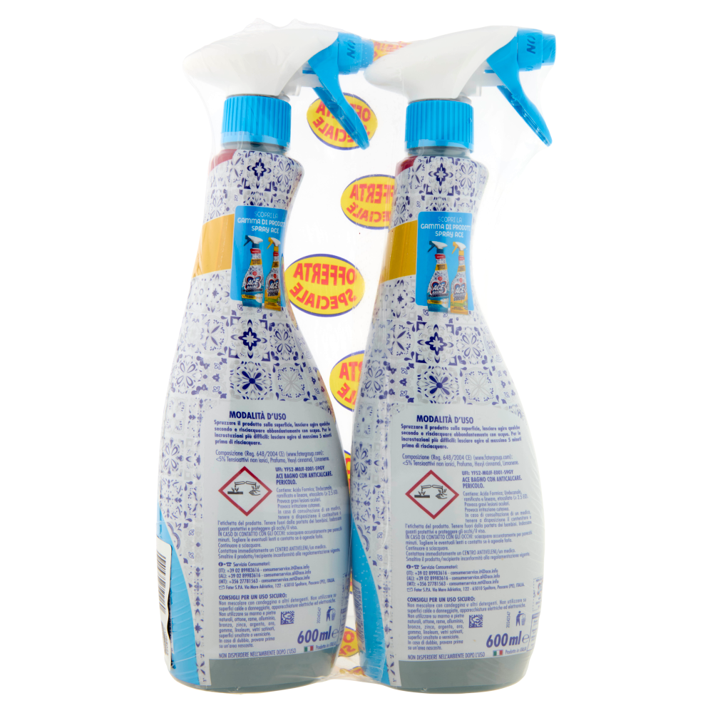 UFI: YFS2-M0JF-E001-S9GY Ace bagno con anticalcare. PERICOLO. Contiene: Acido Formico; Undecanolo, ramificato e lineare, etossilato (≥ 2.5 EO). Provoca gravi lesioni oculari. Provoca irritazione cutanea. In caso di consultazione di un medico, tenere a disposizione il contenitore o l'etichetta del prodotto. Tenere fuori dalla portata dei bambini. Indossare guanti protettivi e proteggere gli occhi/il viso. IN CASO DI CONTATTO CON GLI OCCHI: sciacquare accuratamente per parecchi minuti. Togliere le eventuali lenti a contatto se è agevole farlo. Continuare a sciacquare. Contattare immediatamente un CENTRO ANTIVELENI/un medico. Smaltire il prodotto/recipiente in conformità alla regolamentazione vigente.