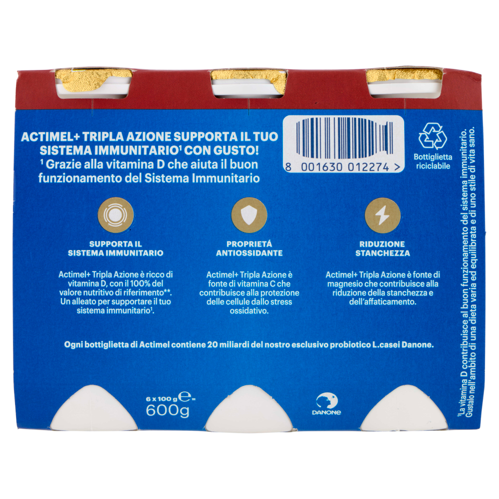 Actimel+ Tripla Azione supporta il tuo sistema immunitario¹ con gusto! ¹Grazie alla vitamina D che aiuta il buon funzionamento del Sistema Immunitario Supporta il sistema immunitario Actimel+ Tripla Azione è ricco di vitamina D, con il 100% del valore nutritivo di riferimento**. Un alleato per supportare il tuo sistema immunitario¹. Proprietà antiossidante Actimel+ Tripla Azione è fonte di vitamina C che contribuisce alla protezione delle cellule dallo stress ossidativo. Riduzione stanchezza Actimel+ Tripla Azione è fonte di magnesio che contribuisce alla riduzione della stanchezza e dell'affaticamento. **VNR= Valori Nutritivi di Riferimento ¹La vitamina D contribuisce al buon funzionamento del sistema immunitario. Gustalo nell'ambito di una dieta varia ed equilibrata e di uno stile di vita sano. Ogni bottiglietta di Actimel contiene 20 miliardi del nostro esclusivo probiotico L.casei Danone.