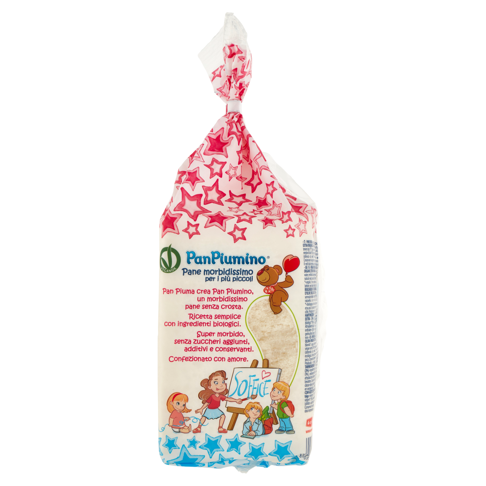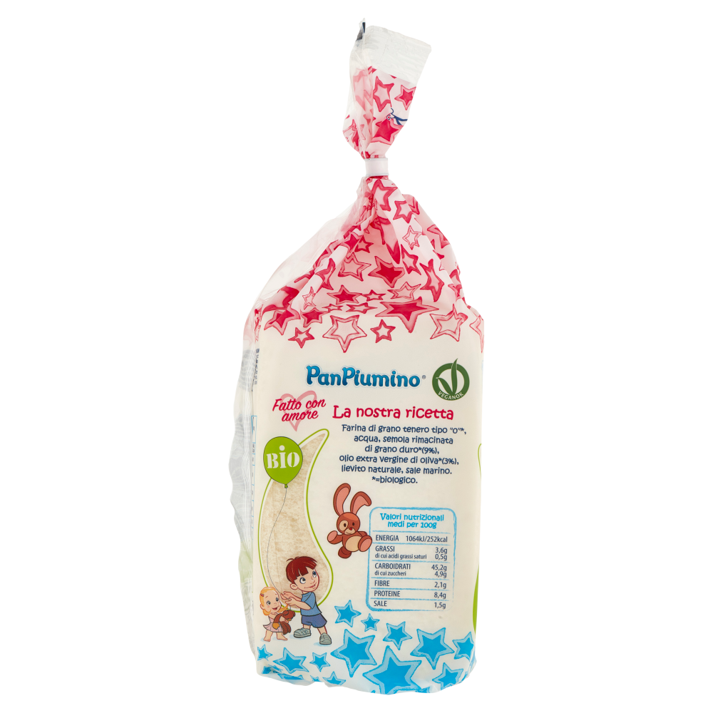 Pan piuma crea Pan Piumino, morbidissimo un pane senza crosta. Ricetta semplice con ingredienti biologici. Super morbido, senza zuccheri aggiunti, additivi e conservanti. Confezionato con amore. La nostra ricetta Farina di grano tenero tipo "0"*, acqua, semola rimacinata di grano duro*(9%), olio extra vergine di oliva*(3%), lievito naturale, sale marino. *=biologico.