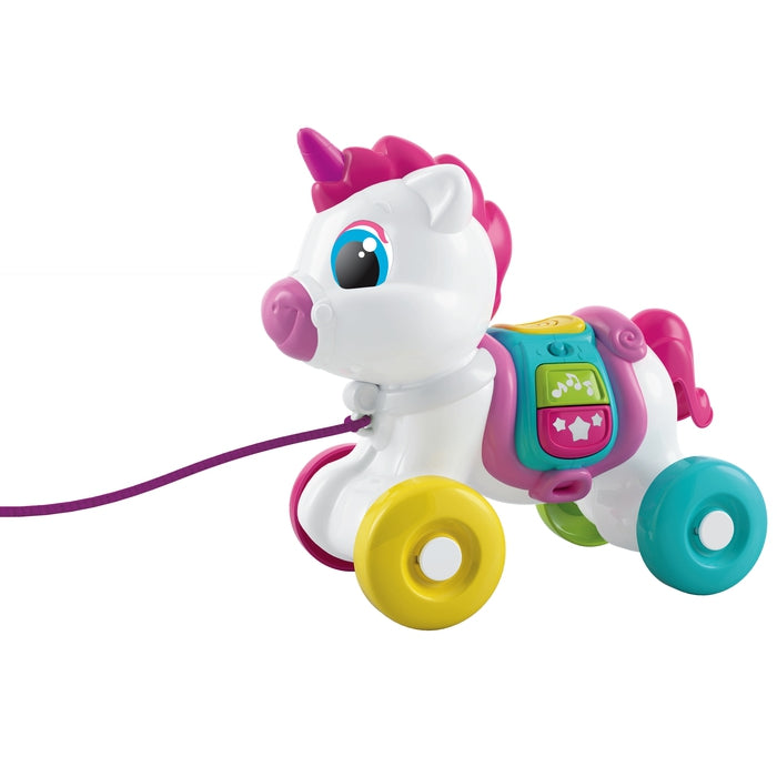 Grazie ai tasti interattivi, alle ruote ed il cordino, l'unicorno supporta lo sviluppo sensoriale, motorio e del linguaggio.