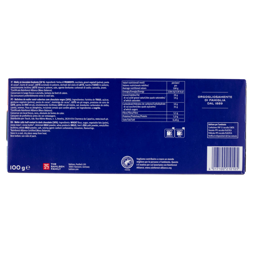 Bahlsen per l'ambiente Confezione: PAP 21 - raccolta carta Vassoio: PP5 - raccolta plastica Pellicola: PP5 - raccolta plastica Verifica le disposizioni del tuo comune