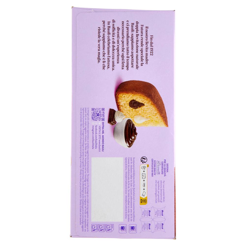 Fin dal 1922 il nostro lievito madre Futura rende speciale la doppia lievitazione naturale Bauli: sappiamo aspettare e ci prendiamo tutto il tempo necessario perché ogni fetta diventi un'esperienza di sofficità e di dolcezza unica. In Bauli celebriamo l'attesa, perché sappiamo che è lì che risiede la vera magia. Sistema per la qualità certificato Bauli - Sistema qualità certificato ISO 9001 Per i suoi prodotti Bauli seleziona attentamente gli ingredienti, per garantirti che non contengano OGM Entra nel mondo Bauli Visita il sito www.bauli.it Seguici su Facebook.com/bauliItalia Instagram.com/bauliitalia
