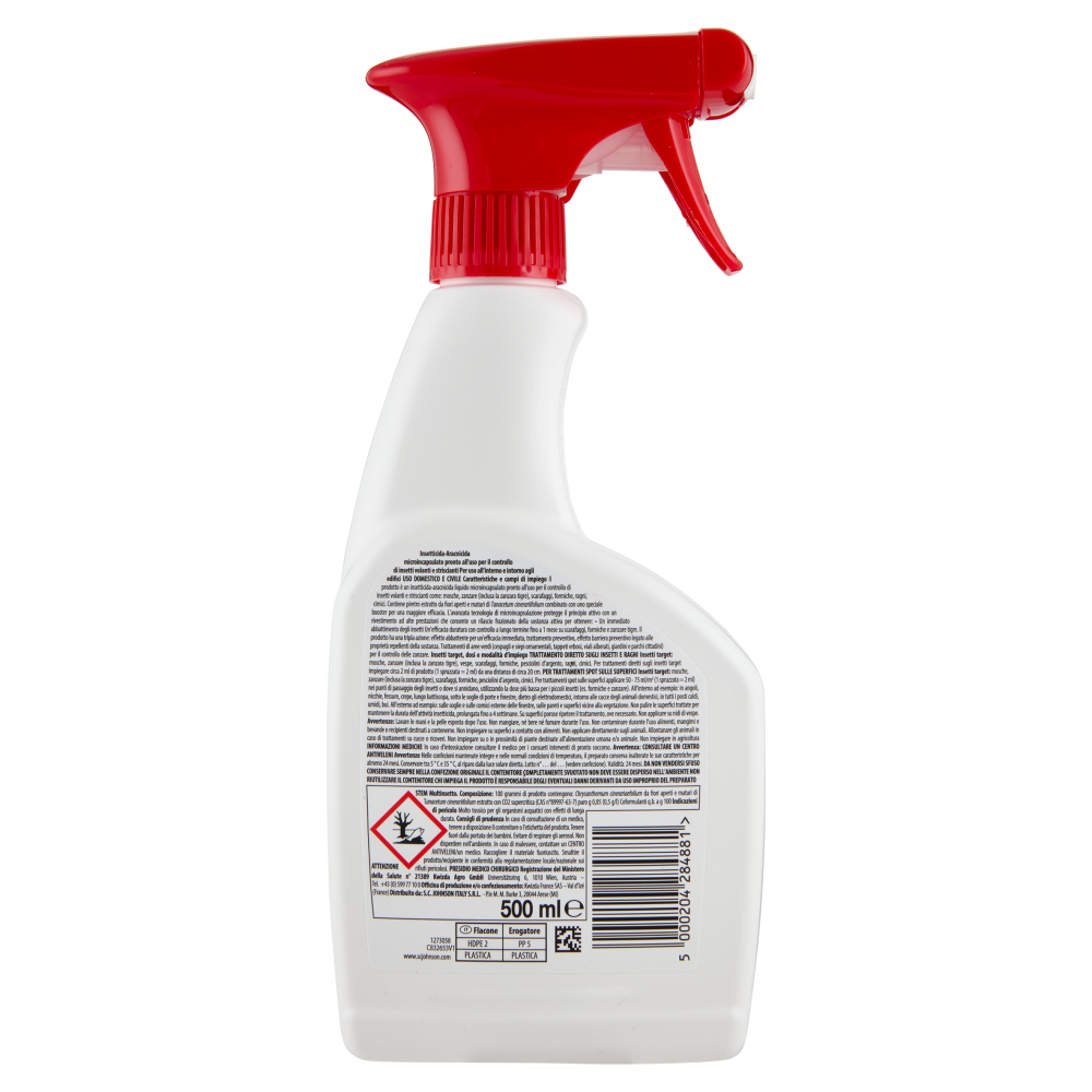 Insetti target, dosi e modalità d'impiego Trattamento diretto sugli insetti e ragni Insetti target: mosche, zanzare (inclusa la zanzara tigre), vespe, scarafaggi, formiche, pesciolini d'argento, ragni, cimici. Per trattamenti diretti sugli insetti target impiegare circa 2 ml di prodotto (1 spruzzata = 2 ml) da una distanza di circa 20 cm. Per trattamenti spot sulle superfici insetti target: mosche, zanzare (inclusa la zanzara tigre), scarafaggi, formiche, pesciolini d'argento, cimici. Per trattamenti spot sulle superfici applicare 50 - 75 ml/m² (1 spruzzata = 2 ml) nei punti di passaggio degli insetti o dove si annidano, utilizzando la dose più bassa per i piccoli insetti (es. formiche e zanzare). All'interno ad esempio: in angoli, nicchie, fessure, crepe, lungo battiscopa, sotto le soglie di porte e finestre, dietro gli elettrodomestici, intorno alle cucce degli animali domestici, in tutti i posti caldi, umidi, bui. All'esterno ad esempio: sulle soglie e sulle cornici esterne delle finestre, sulle pareti e superfici vicine alla vegetazione. Non pulire le superfici trattate per mantenere la durata dell'attività insetticida, prolungata fino a 4 settimane. Su superfici porose ripetere il trattamento, ove necessario. Non applicare su nidi di vespe.