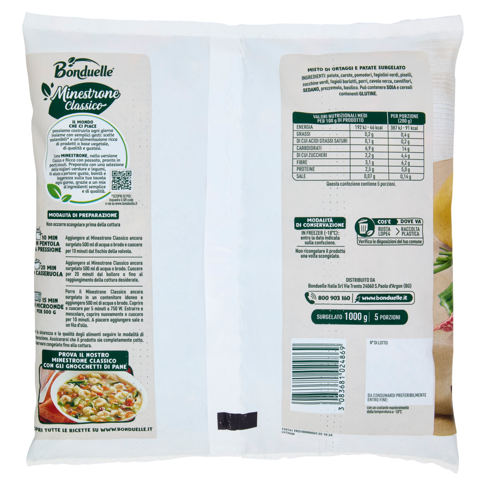 Modalità di preparazione Non occorre scongelare prima della cottura 10 min in pentola a pressione Aggiungere al Minestrone Classico ancora surgelato 500 ml di acqua o brodo e cuocere per 10 minuti dal fischio della valvola. 20 min in casseruola Aggiungere al Minestrone Classico ancora surgelato 500 ml di acqua o brodo. Cuocere per 20 minuti dal bollore o fino al raggiungimento della cottura desiderata. 15 min in microonde per 500 g Porre il Minestrone Classico ancora surgelato in un contenitore idoneo e aggiungere 500 ml di acqua o brodo. Coprire e cuocere per 5 minuti a 750 W. Estrarre e mescolare, coprire nuovamente e cuocere per 10 minuti. A piacere aggiungere sale e un filo d'olio. Per la sicurezza e la qualità degli alimenti seguire le modalità di preparazione. Assicurarsi che il prodotto sia completamente cotto. Conservare congelato fino alla cottura.