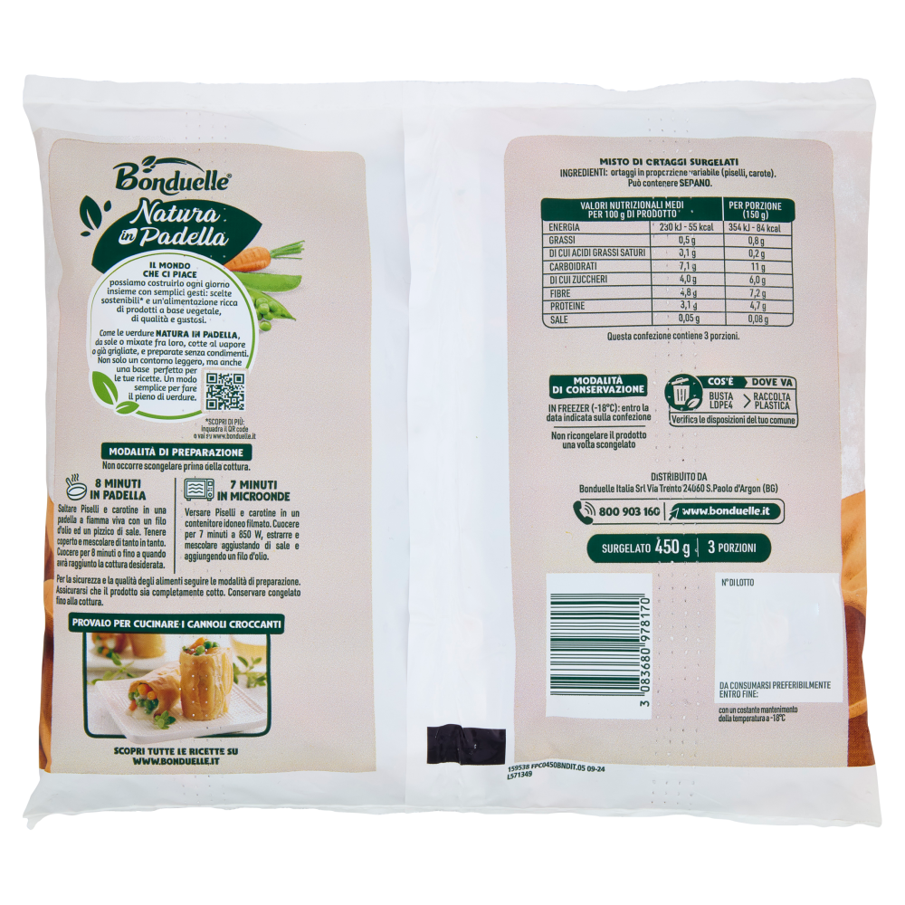 Modalità di preparazione Non occorre scongelare prima della cottura. 8 Minuti in padella Saltare Piselli e carotine in una padella a fiamma viva con un filo d'olio ed un pizzico di sale. Tenere coperto e mescolare di tanto in tanto. Cuocere per 8 minuti o fino a quando avrà raggiunto la cottura desiderata. 7 Minuti in microonde Versare Piselli e carotine in un contenitore idoneo filmato. Cuocere per 7 minuti a 850 W, estrarre e mescolare aggiustando di sale e aggiungendo un filo d'olio. Per la sicurezza e la qualità degli alimenti seguire le modalità di preparazione. Assicurarsi che il prodotto sia completamente cotto. Conservare congelato fino alla cottura.