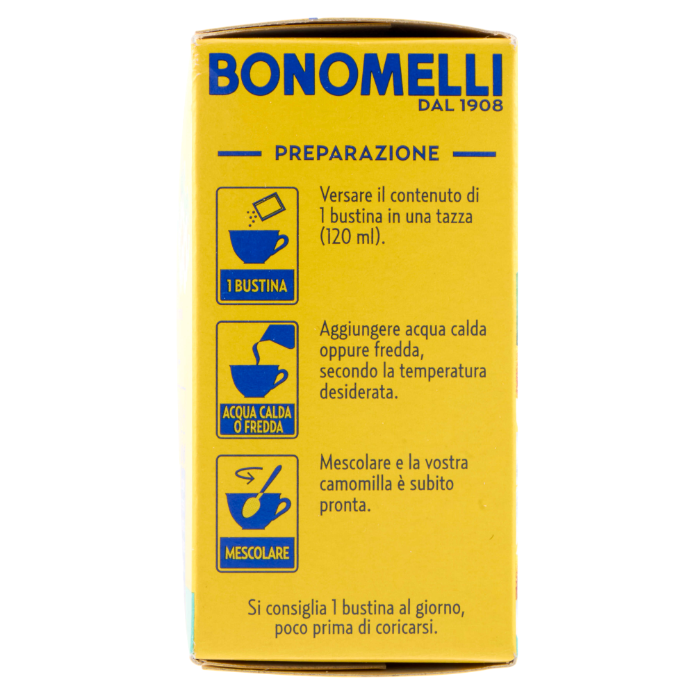 Preparazione Versare il contenuto di 1 bustina in una tazza (120 ml). Aggiungere acqua calda oppure fredda, secondo la temperatura desiderata. Mescolare e la vostra camomilla è subito pronta. Si consiglia 1 bustina al giorno, poco prima di coricarsi.
