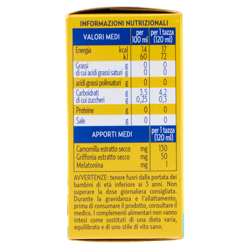 Senza glutinePreparato solubile per bevanda a base di estratto di camomilla e griffonia, con melatonina Complemento alimentare Senza glutine