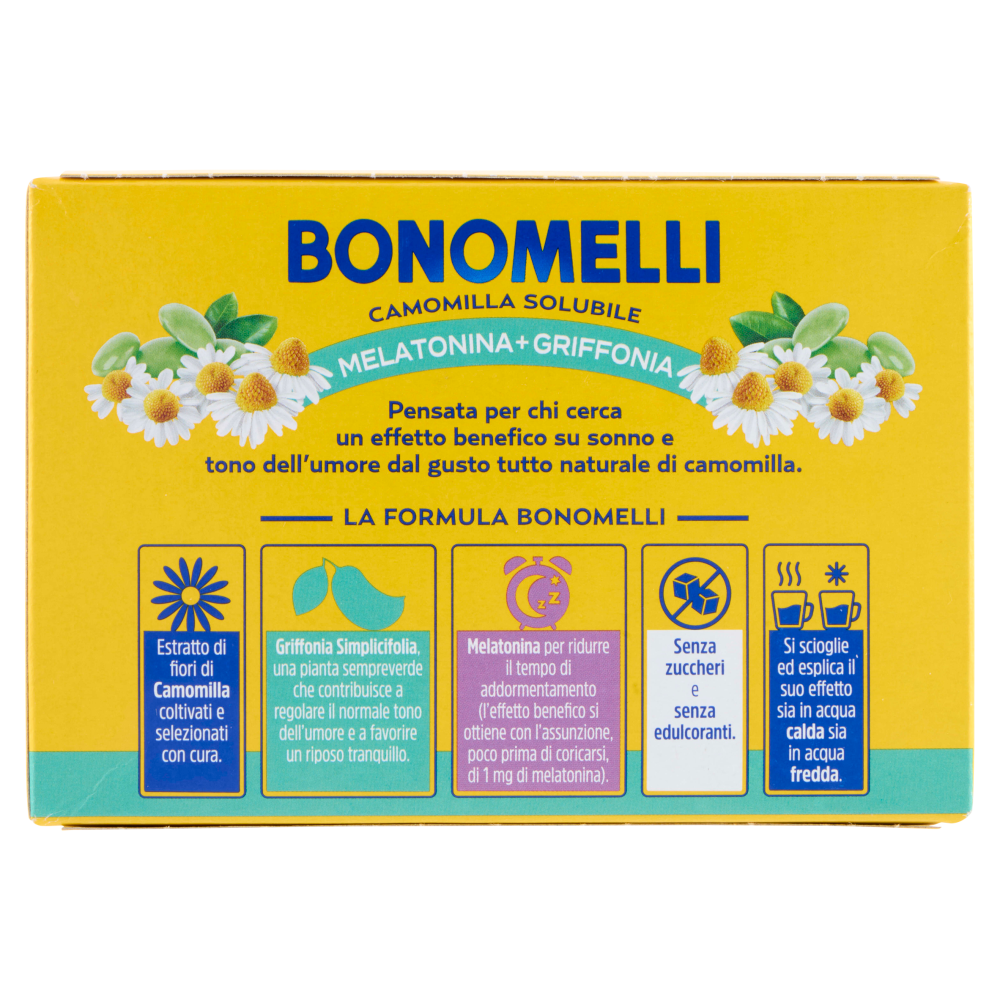 Pensata per chi cerca un effetto benefico su sonno e tono dell'umore dal gusto tutto naturale di camomilla. La formula Bonomelli Estratto di fiori di Camomilla coltivati e selezionati con cura. Griffonia Simplicifolia, una pianta sempreverde che contribuisce a regolare il normale tono dell'umore e a favorire un riposo tranquillo. Melatonina per ridurre il tempo di addormentamento (l'effetto benefico si ottiene con l'assunzione, poco prima di coricarsi, di 1 mg di melatonina). Senza zuccheri e senza edulcoranti. Si scioglie ed esplica il suo effetto sia in acqua calda sia in acqua fredda. Estratto ottenuto dai migliori fiori di camomilla, immediatamente solubile. Dal sapore delicato, è ideale per addormentarsi in fretta (melatonina) e svegliarsi con il normale tono dell'umore (griffonia).