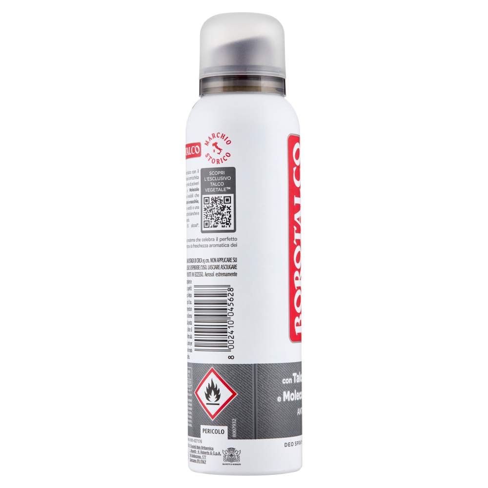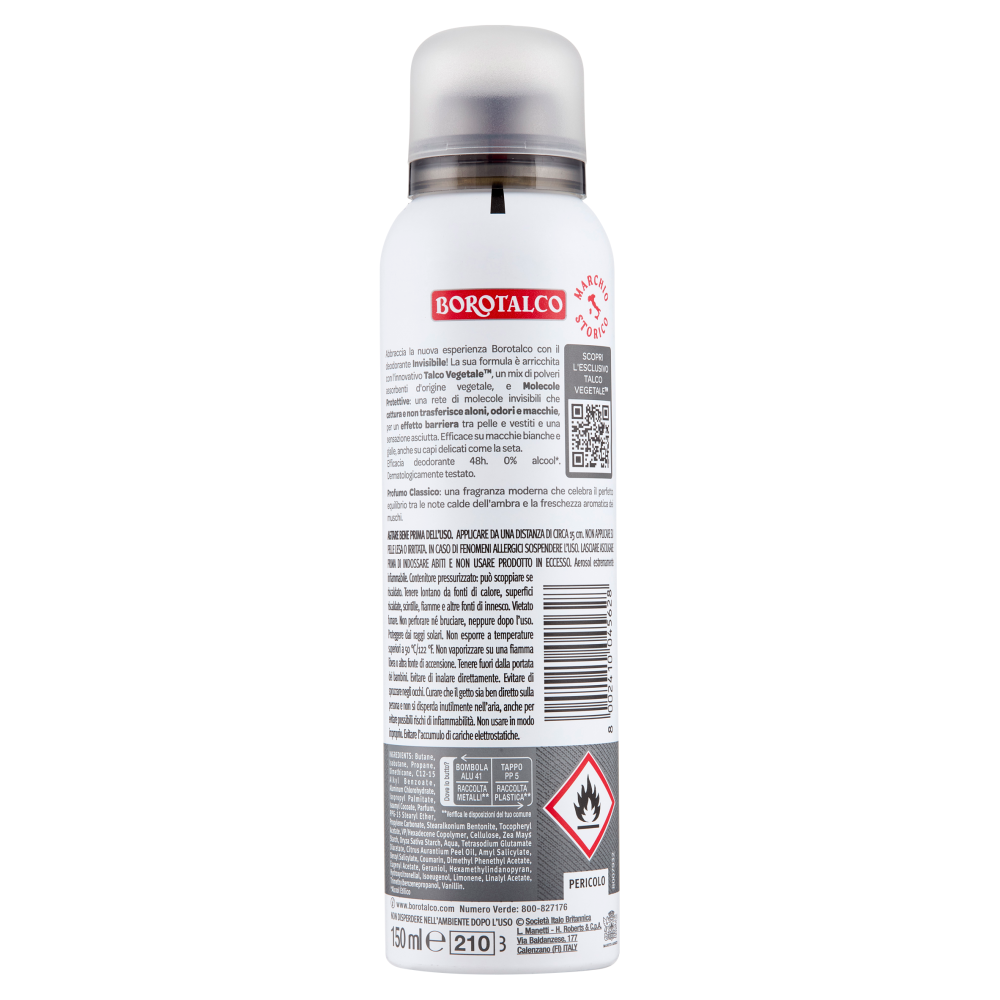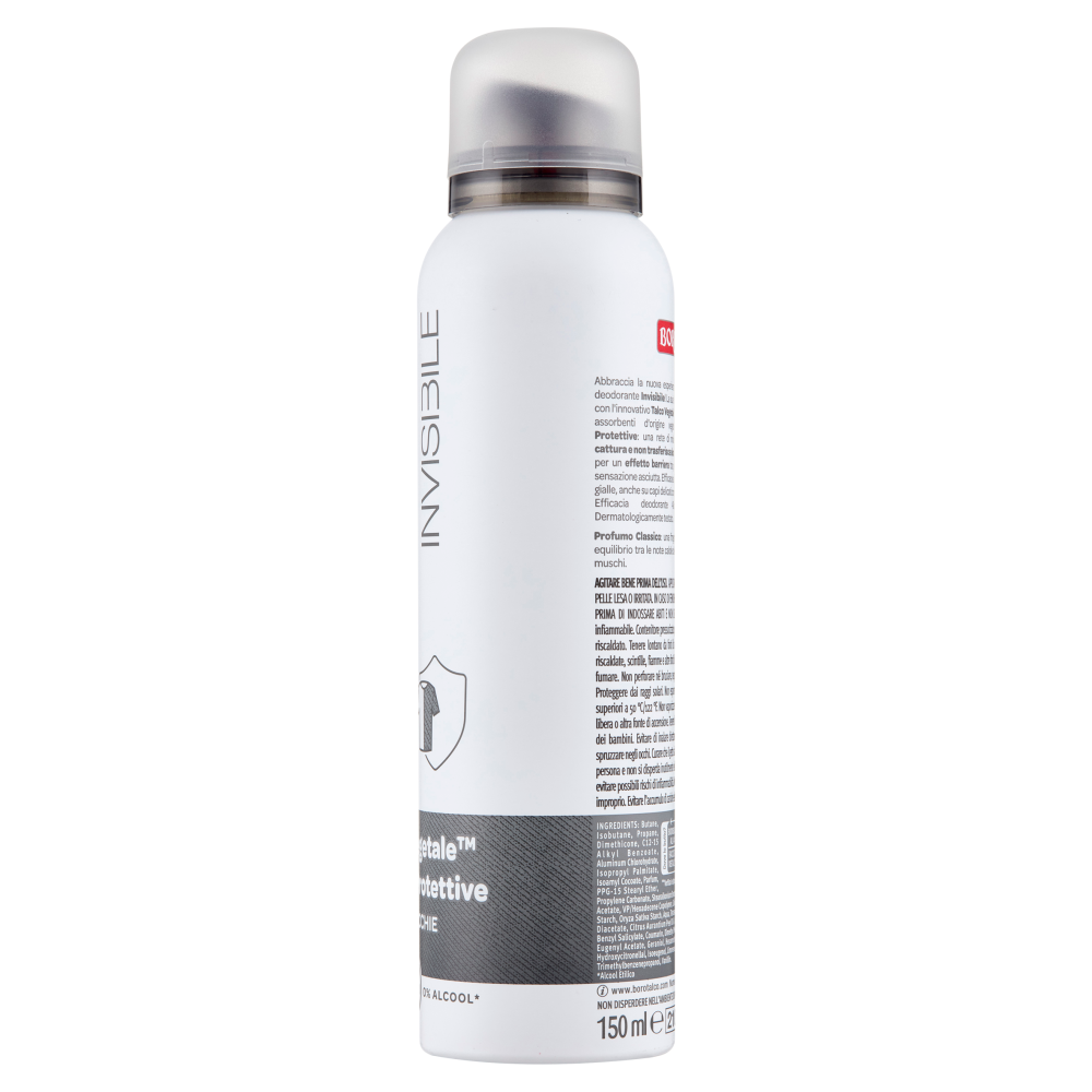 Abbraccia la nuova esperienza Borotalco con il deodorante Invisibile! La sua formula è arricchita con l'innovativo Talco Vegetale, un mix di polveri assorbenti d'origine vegetale, e Molecole Protettive: una rete di molecole invisibili che cattura e non trasferisce aloni, odori e macchie, per un effetto barriera tra pelle e vestiti e una sensazione asciutta. Efficace su macchie bianche e gialle, anche su capi delicati come la seta. Efficacia deodorante 48h. 0% alcool*. Dermatologicamente testato. *Alcool Etilico Profumo Classico: una fragranza moderna che celebra il perfetto equilibrio tra le note calde dell'ambra e la freschezza aromatica dei muschi.