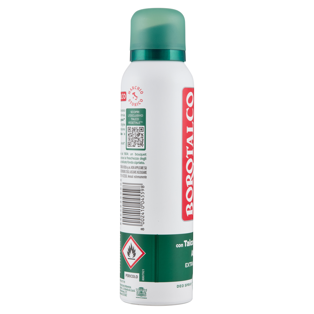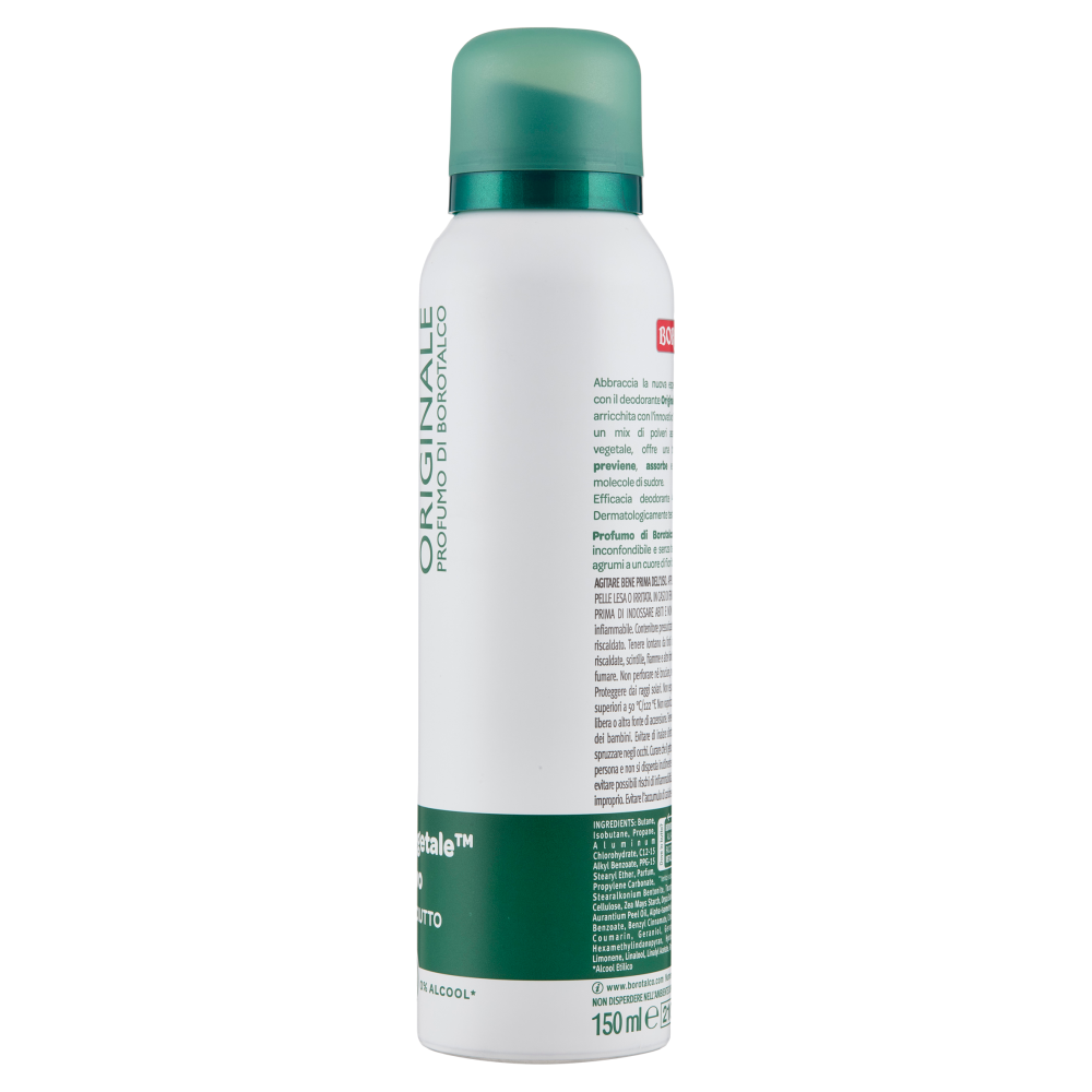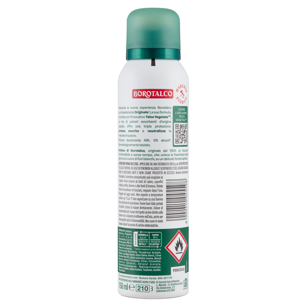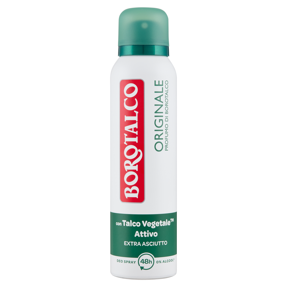 Abbraccia la nuova esperienza Borotalco con il deodorante Originale! La sua formula, arricchita con l'innovativo Talco Vegetale, un mix di polveri assorbenti d'origine vegetale, offre una tripla protezione: previene, assorbe e neutralizza le molecole di sudore. Efficacia deodorante 48h. 0% alcool*. Dermatologicamente testato. *Alcool Etilico Profumo di Borotalco, originale dal 1904: un bouquet inconfondibile e senza tempo, che unisce la freschezza degli agrumi a un cuore di fiori bianchi, su un delicato fondo cipriato