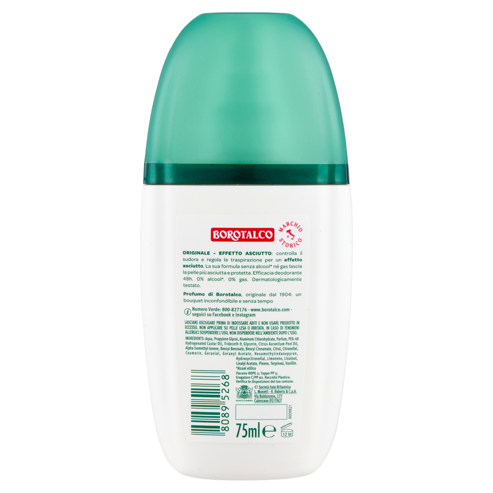 Originale - Effetto asciutto: controlla il sudore e regola la traspirazione per un effetto asciutto. La sua formula senza alcool* né gas lascia la pelle più asciutta e protetta. Efficacia deodorante 48h. 0% alcool*. 0% gas. Dermatologicamente testato. *Alcool etilico Profumo di Borotalco, originale dal 1904: un bouquet inconfondibile e senza tempo
