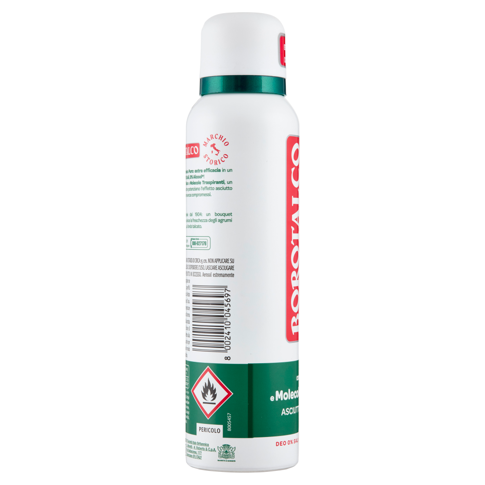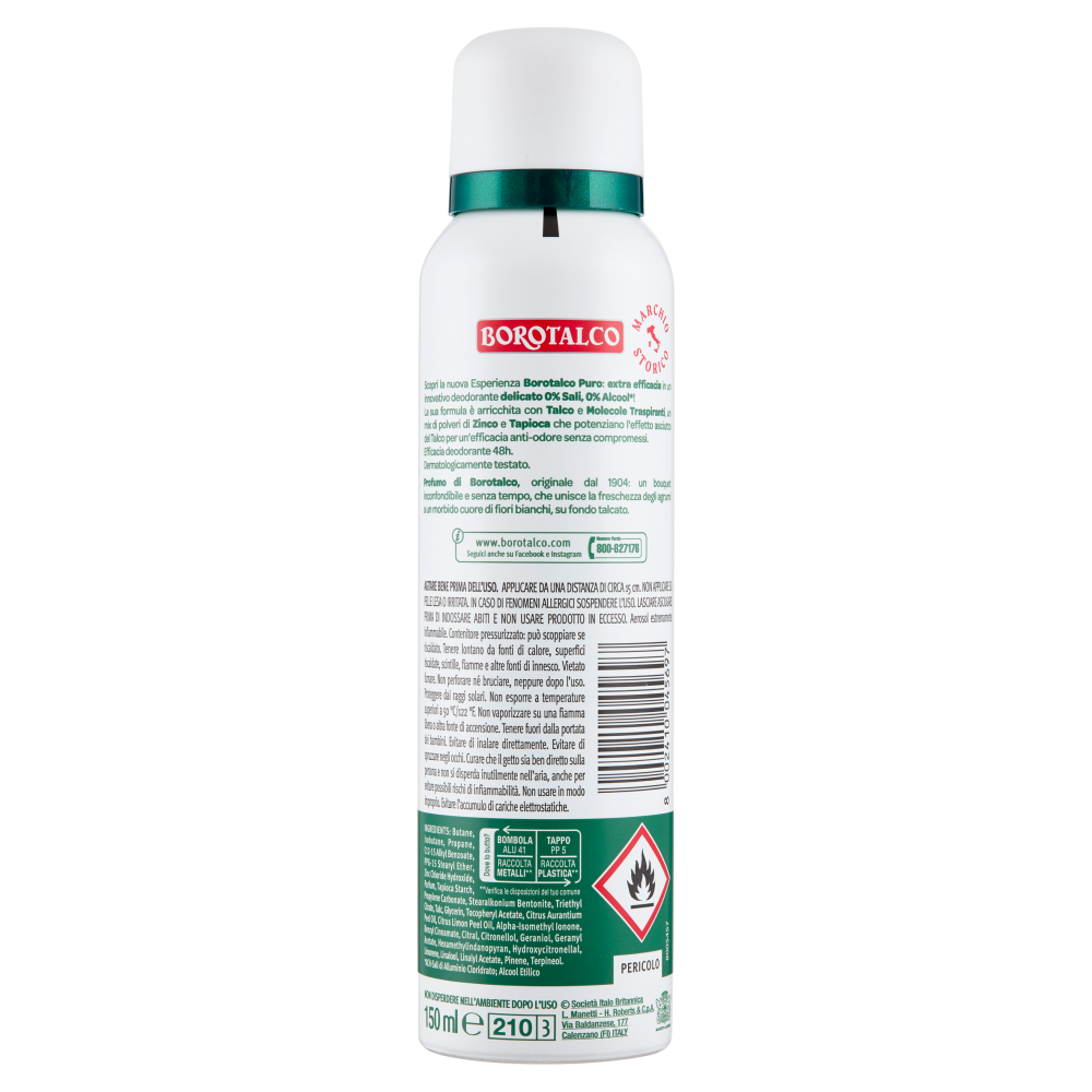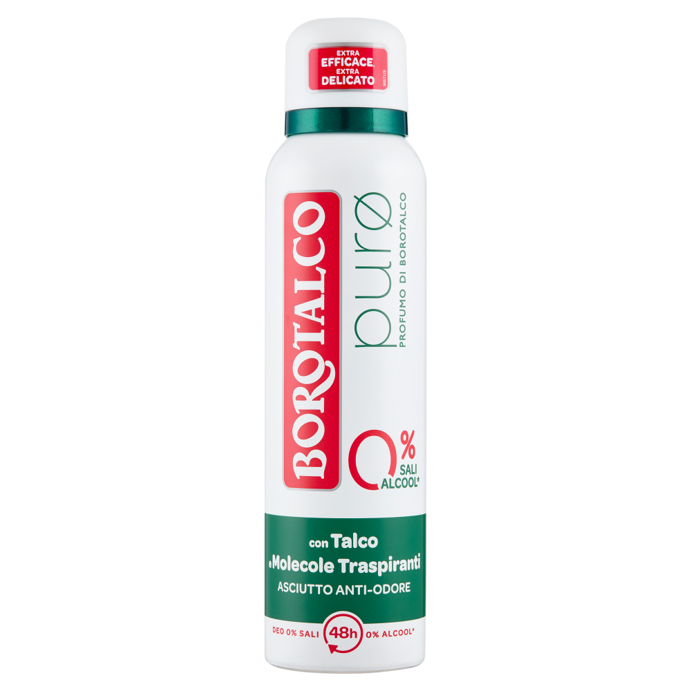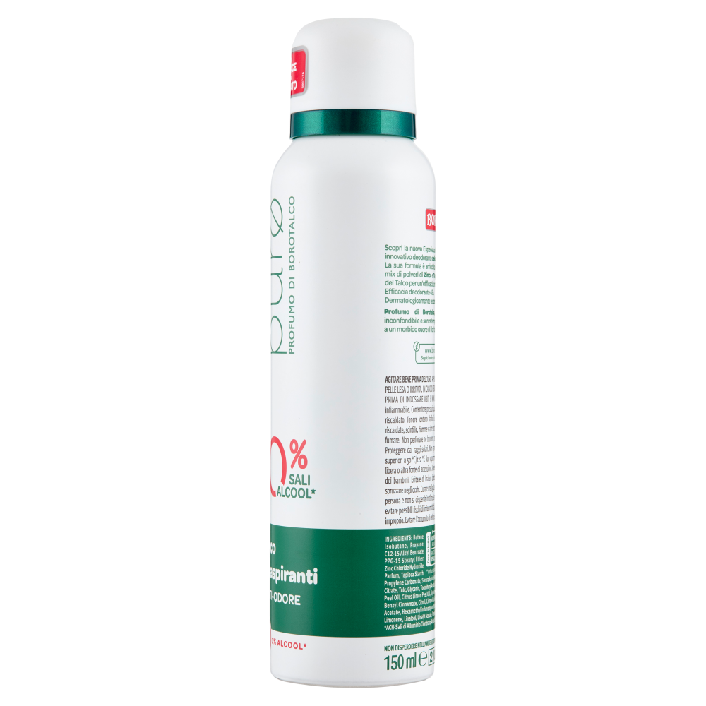 Scopri la nuova Esperienza Borotalco Puro: extra efficacia in un innovativo deodorante delicato 0% Sali, 0% Alcool*! La sua formula è arricchita con Talco e Molecole Traspiranti, un mix di polveri di Zinco e Tapioca che potenziano l'effetto asciutto del Talco per un'efficacia anti-odore senza compromessi. Efficacia deodorante 48h. Dermatologicamente testato. *ACH-Sali di Alluminio Cloridrato; Alcool Etilico Profumo di Borotalco, originale dal 1904: un bouquet inconfondibile e senza tempo, che unisce la freschezza degli agrumi a un morbido cuore di fiori bianchi, su fondo talcato.