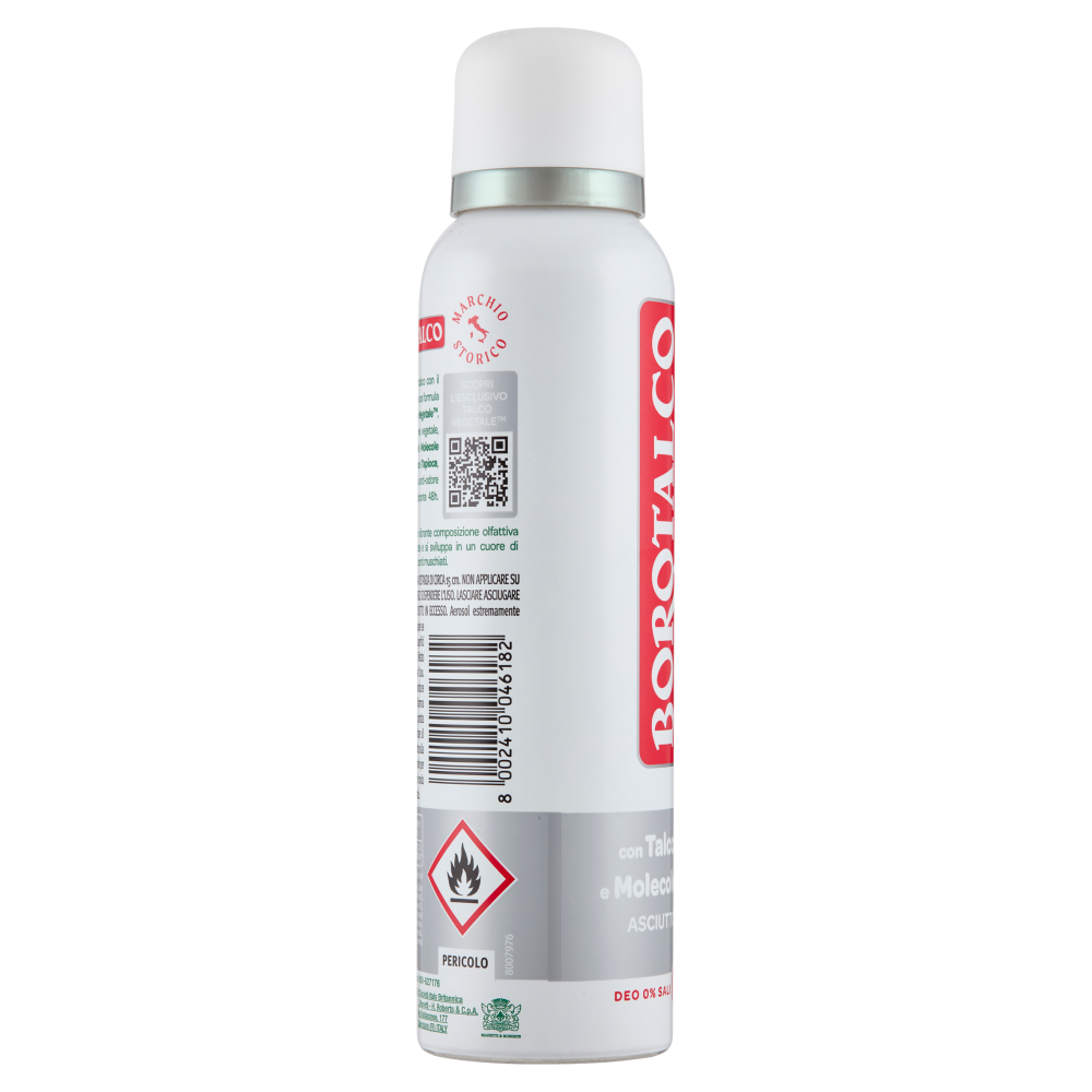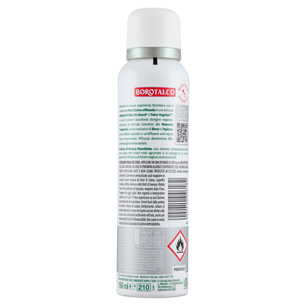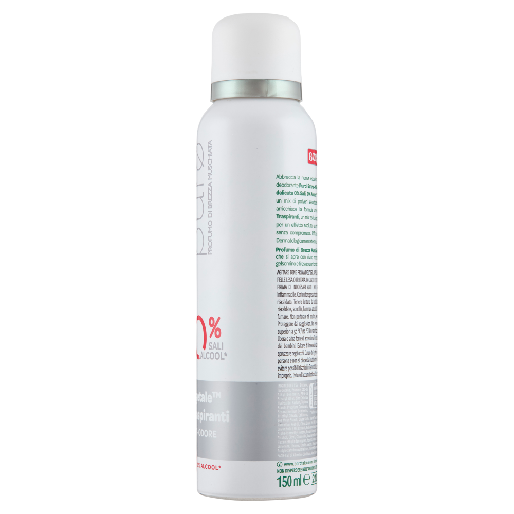 Abbraccia la nuova esperienza Borotalco con il deodorante Puro! Extra-efficacia in una formula delicata 0% Sali, 0% Alcool*. Il Talco Vegetale, un mix di polveri assorbenti d'origine vegetale, arricchisce la formula unendosi alle Molecole Traspiranti, un mix esclusivo di Zinco e Tapioca, per un effetto asciutto e un'efficacia anti-odore senza compromessi. Efficacia deodorante 48h. Dermatologicamente testato. *ACH-Sali di Alluminio Cloridrato; Alcool Etilico Profumo di Brezza Muschiata: una vibrante composizione olfattiva che si apre con vivaci note agrumate e si sviluppa in un cuore di gelsomino e fresia su un fondo dagli accenti muschiati.