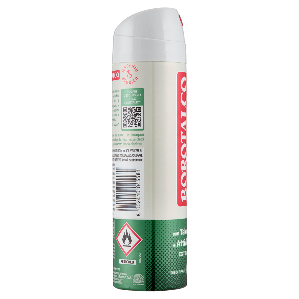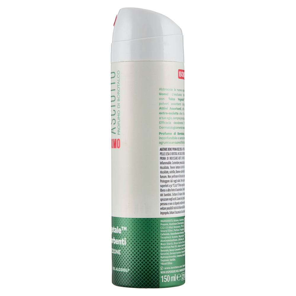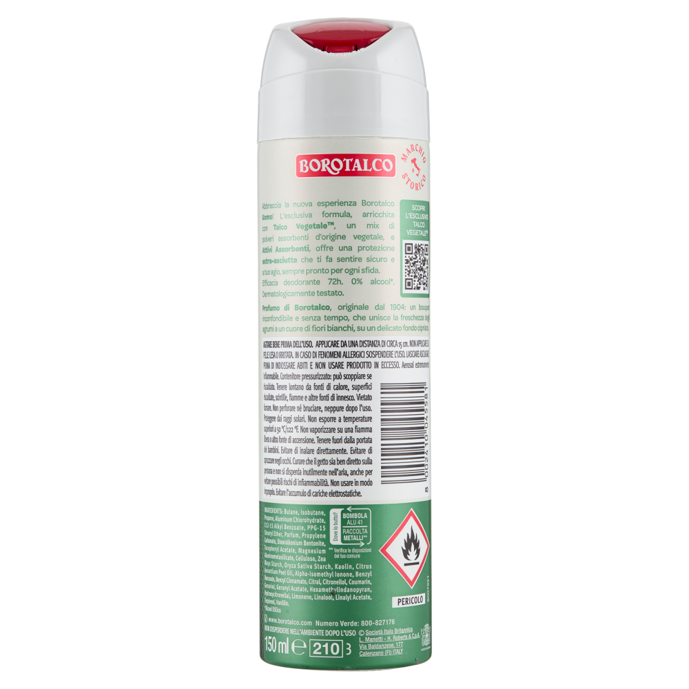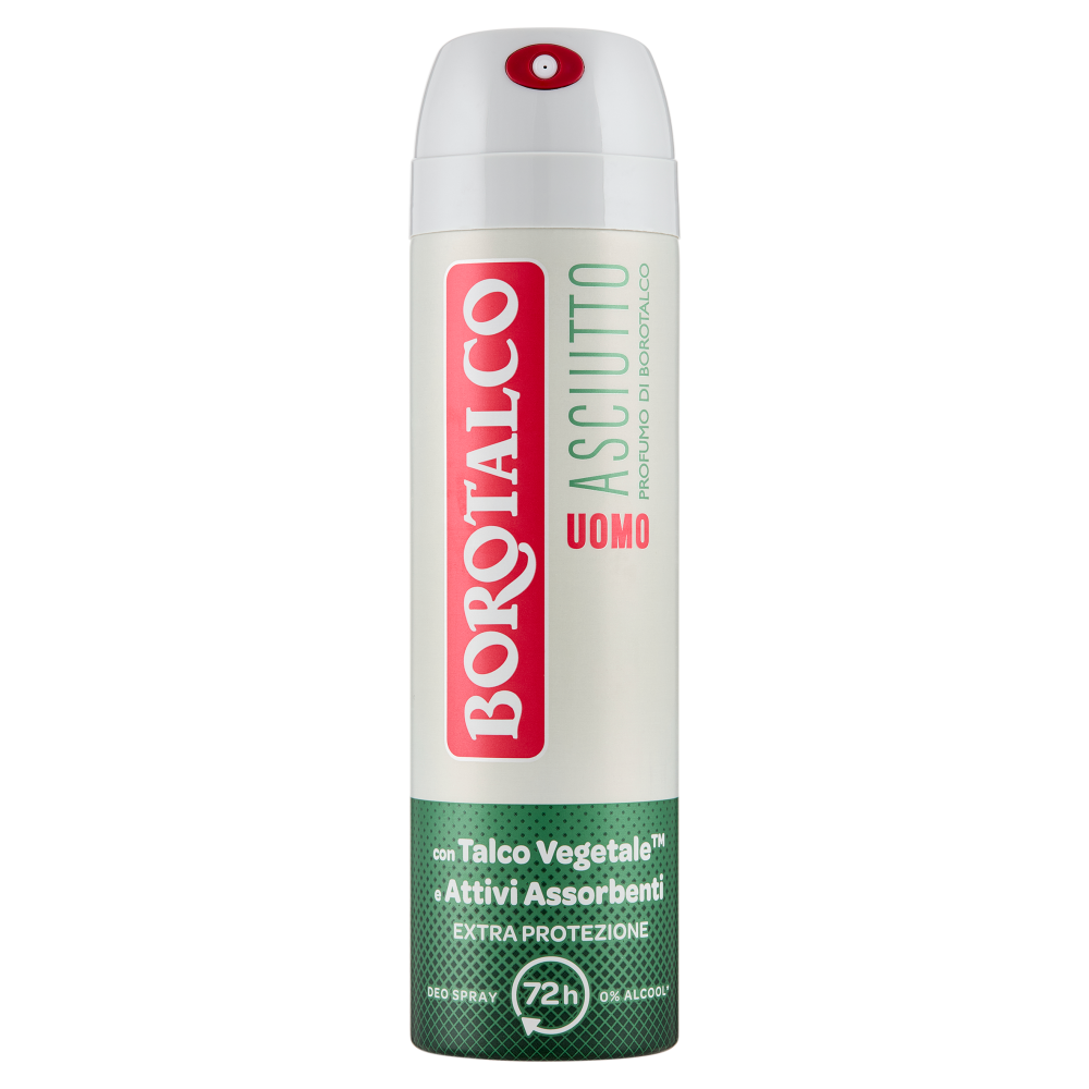 Abbraccia la nuova esperienza Borotalco Uomo! L'esclusiva formula, arricchita con Talco Vegetale, un mix di polveri assorbenti d'origine vegetale, e Attivi Assorbenti, offre una protezione extra-asciutta che ti fa sentire sicuro e a tuo agio, sempre pronto per ogni sfida. Efficacia deodorante 72h. 0% alcool*. Dermatologicamente testato. *Alcool Etilico Profumo di Borotalco, originale dal 1904: un bouquet inconfondibile e senza tempo, che unisce la freschezza degli agrumi a un cuore di fiori bianchi, su un delicato fondo cipriato.