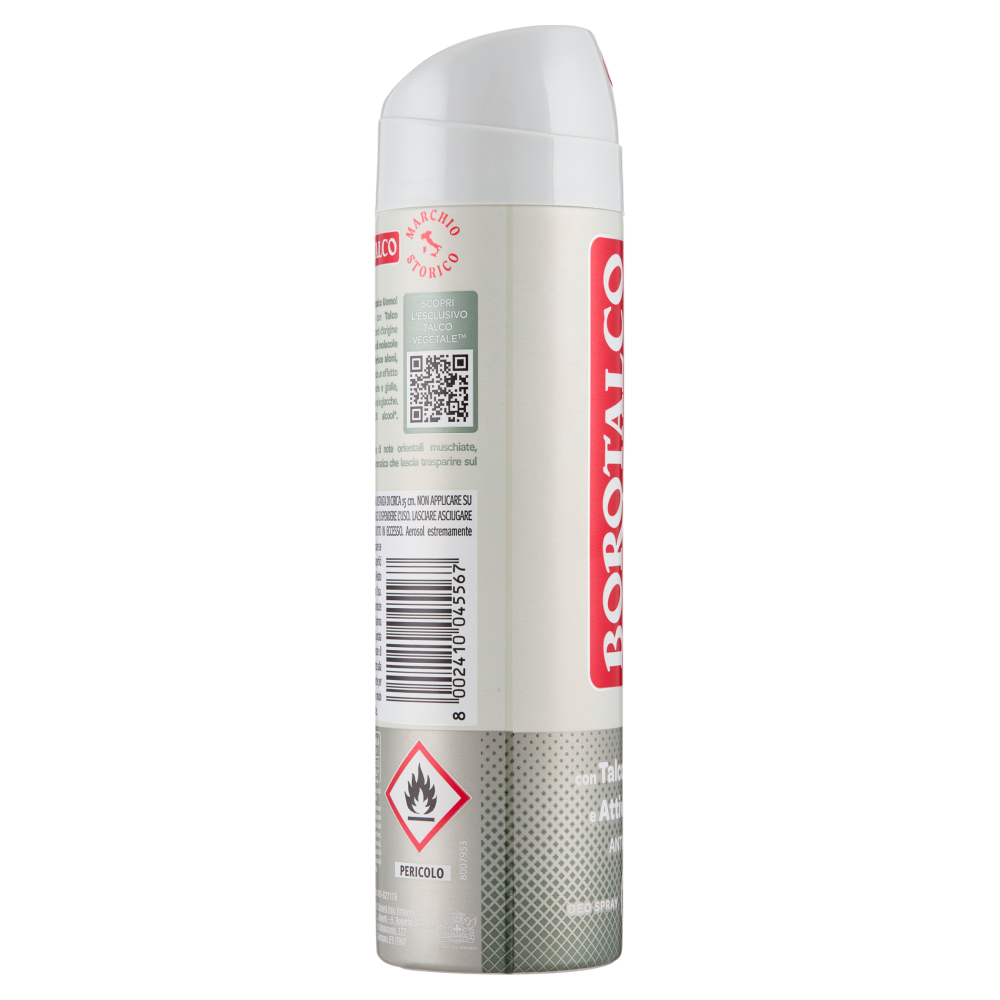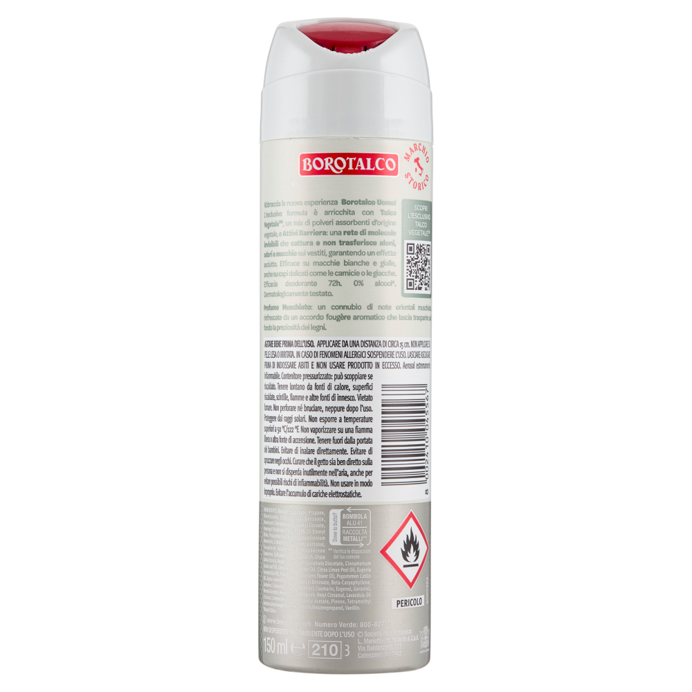 Abbraccia la nuova esperienza Borotalco Uomo! L'esclusiva formula è arricchita con Talco Vegetale, un mix di polveri assorbenti d'origine vegetale, e Attivi Barriera: una rete di molecole invisibili che cattura e non trasferisce aloni, odori e macchie sui vestiti, garantendo un effetto asciutto. Efficace su macchie bianche e gialle, anche su capi delicati come le camicie o le giacche. Efficacia deodorante 72h. 0% alcool.* Dermatologicamente testato. *Alcool Etilico Profumo Muschiato: un connubio di note orientali muschiate, rinfrescate da un accordo fougère aromatico che lascia trasparire sul fondo la preziosità dei legni.