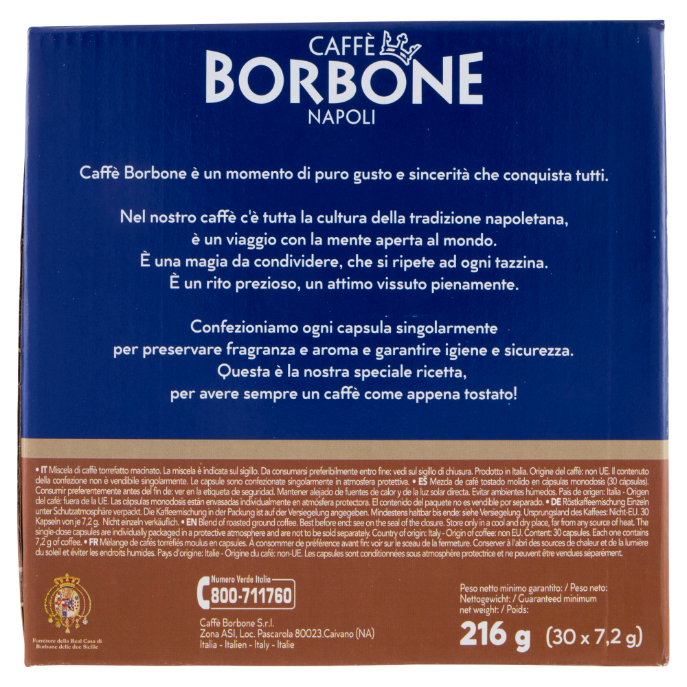 30 Capsule Compatibili con Macchine a Marchio Lavazza* A Modo Mio* *Lavazza *A Modo Mio *Lavazza A Modo Mio sono marchi di proprietà di Luigi Lavazza S.p.A.. Caffè Borbone S.r.l. è produttore autonomo non collegato alla Luigi Lavazza S.p.A.. La compatibilità delle capsule di Caffè Borbone è funzionale all'utilizzo con macchine da caffè Lavazza A Modo Mio.