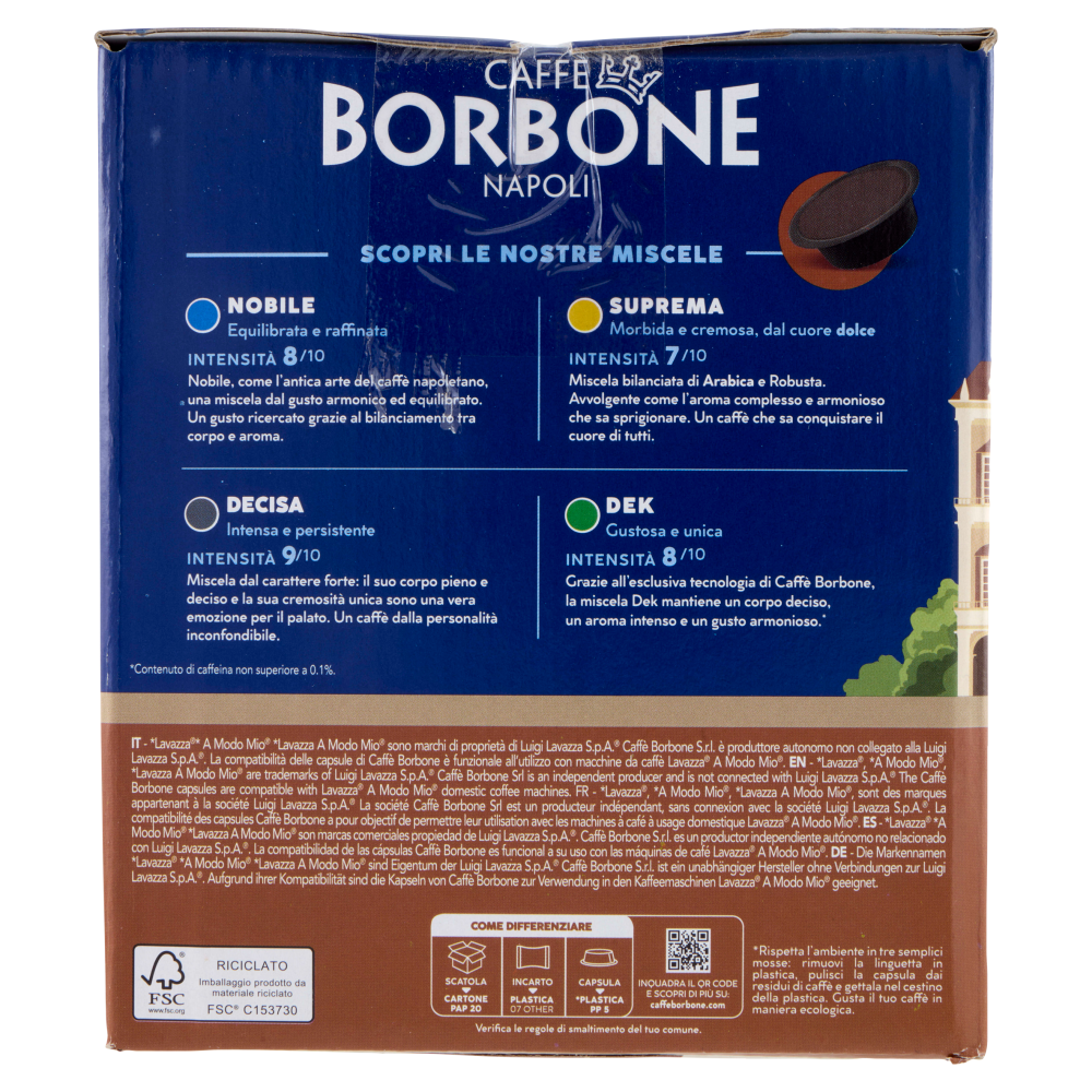 Caffè Borbone Napoli Caffè Borbone è un momento di puro gusto e sincerità che conquista tutti. Nel nostro caffè c'è tutta la cultura della tradizione napoletana, è un viaggio con la mente aperta al mondo. È una magia da condividere, che si ripete ad ogni tazzina. È un rito prezioso, un attimo vissuto pienamente. Confezioniamo ogni capsula singolarmente per preservare fragranza e aroma e garantire igiene e sicurezza. Questa è la nostra speciale ricetta, per avere sempre un caffè come appena tostato! Fornitore della Real Casa di Borbone delle due Sicilie Scopri le nostre miscele Nobile Equilibrata e raffinata Intensità 8/10 Nobile, come l'antica arte del caffè napoletano, una miscela dal gusto armonico ed equilibrato. Un gusto ricercato grazie al bilanciamento tra corpo e aroma. Suprema Morbida e cremosa, dal cuore dolce Intensità 7/10 Miscela bilanciata di Arabica e Robusta. Avvolgente come l'aroma complesso e armonioso che sa sprigionare. Un caffè che sa conquistare il cuore di tutti. Decisa Intensa e persistente Intensità 9/10 Miscela dal carattere forte: il suo corpo pieno e deciso e la sua cremosità unica sono una vera emozione per il palato. Un caffè dalla personalità inconfondibile. Dek Gustosa e unica Intensità 8/10 Grazie all'esclusiva tecnologia di Caffè Borbone, la miscela Dek mantiene un corpo deciso, un aroma intenso e un gusto armonioso.* *Contenuto di caffeina non superiore a 0.1%. Inquadra il QR code e scopri di più su: caffeborbone.com