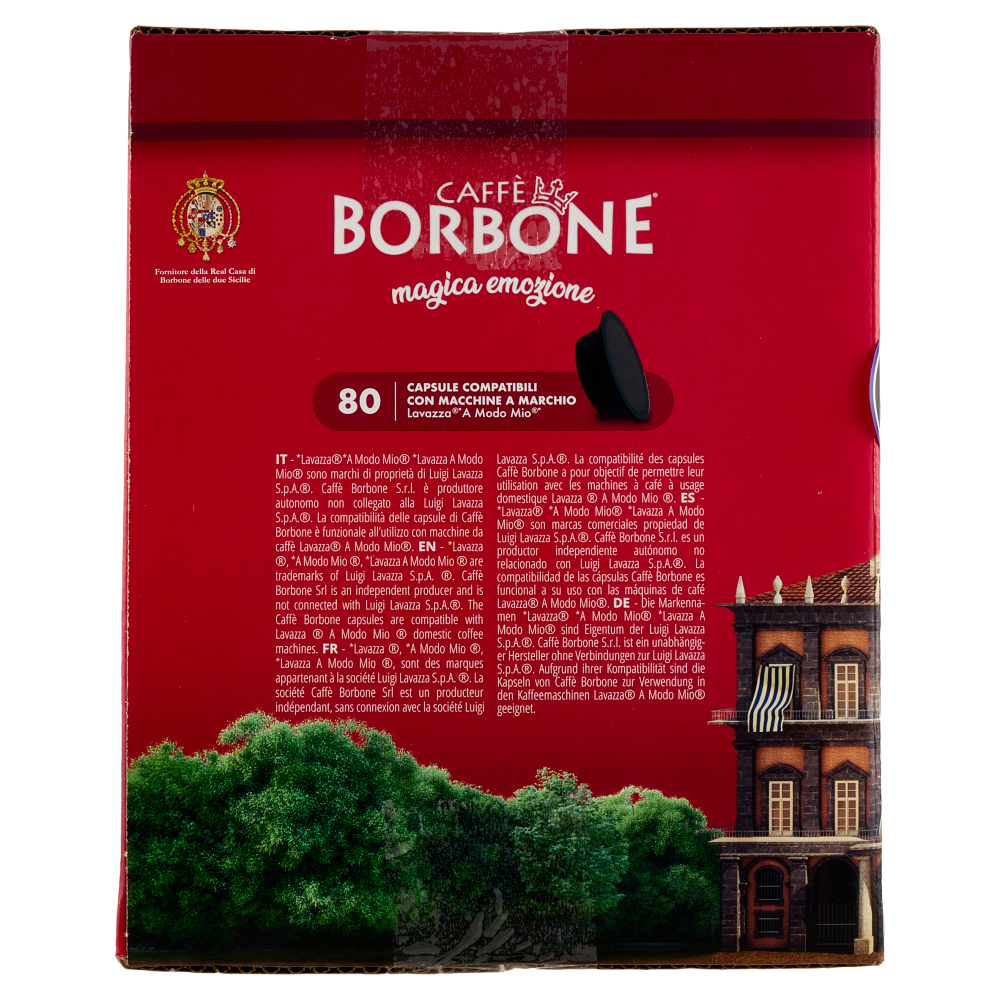 80 Capsule Compatibili con Macchine a Marchio Lavazza* A Modo Mio* *Lavazza *A Modo Mio *Lavazza A Modo Mio sono marchi di proprietà di Luigi Lavazza S.p.A.. Caffè Borbone S.r.l. è produttore autonomo non collegato alla Luigi Lavazza S.p.A.. La compatibilità delle capsule di Caffè Borbone è funzionale all'utilizzo con macchine da caffè Lavazza A Modo Mio.