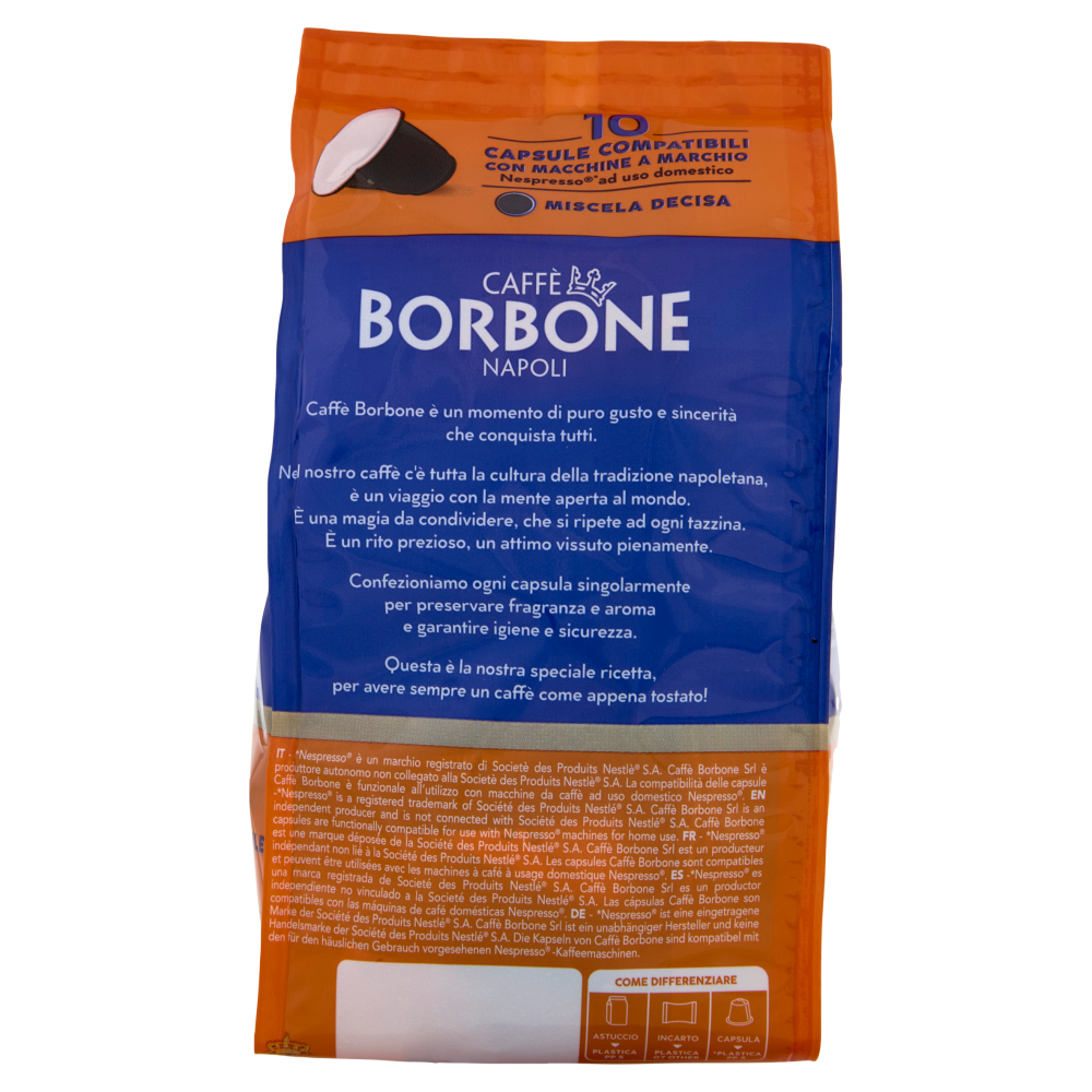 *Nespresso è un marchio registrato di Societè des Produits Nestlè S.A. Caffè Borbone Srl è produttore autonomo non collegato alla Societè des Produits Nestlè S.A. La compatibilità delle capsule Caffè Borbone è funzionale all'utilizzo con macchine da caffè ad uso domestico Nespresso. Il contenuto della confezione non è vendibile singolarmente.