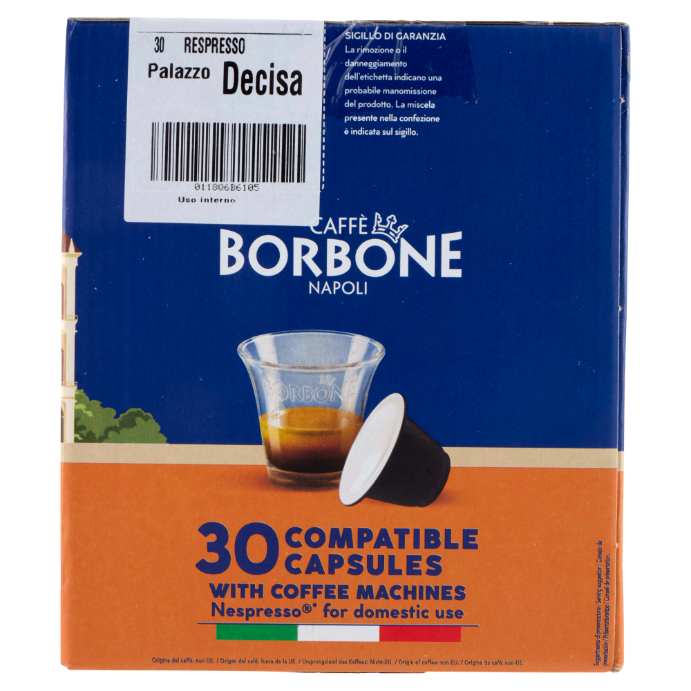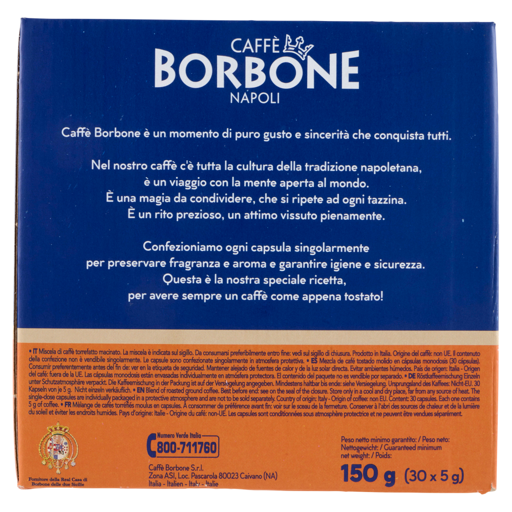 *Nespresso è un marchio registrato di Societè des Produits Nestlè S.A. Caffè Borbone Srl è produttore autonomo non collegato alla Societè des Produits Nestlè S.A. La compatibilità delle capsule Caffè Borbone è funzionale all'utilizzo con macchine da caffè ad uso domestico Nespresso. Il contenuto della confezione non è vendibile singolarmente.