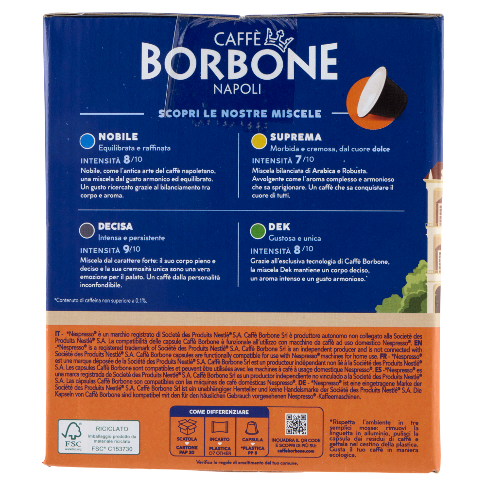Caffè Borbone Napoli Caffè Borbone è un momento di puro gusto e sincerità che conquista tutti. Nel nostro caffè c'è tutta la cultura della tradizione napoletana, è un viaggio con la mente aperta al mondo. È una magia da condividere, che si ripete ad ogni tazzina. È un rito prezioso, un attimo vissuto pienamente. Confezioniamo ogni capsula singolarmente per preservare fragranza e aroma e garantire igiene e sicurezza. Questa è la nostra speciale ricetta, per avere sempre un caffè come appena tostato! Fornitore della Real Casa di Borbone delle due Sicilie Scopri le nostre miscele Nobile Equilibrata e raffinata Intensità 8/10 Nobile, come l'antica arte del caffè napoletano, una miscela dal gusto armonico ed equilibrato. Un gusto ricercato grazie al bilanciamento tra corpo e aroma. Suprema Morbida e cremosa, con più Arabica Intensità 7/10 Miscela bilanciata di Arabica e Robusta. Avvolgente come l'aroma complesso e armonioso che sa sprigionare. Un caffè che sa conquistare il cuore di tutti. Decisa Intensa e persistente Intensità 9/10 Miscela dal carattere forte: il suo corpo pieno e deciso e la sua cremosità unica sono una vera emozione per il palato. Un caffè dalla personalità inconfondibile. Dek Gustosa e unica Intensità 8/10 Grazie all'esclusiva tecnologia di Caffè Borbone, la miscela Dek mantiene un corpo deciso, un aroma intenso e un gusto armonioso.* *Contenuto di caffeina non superiore a 0.1%. Inquadra il QR code e scopri di più su: caffeborbone.com