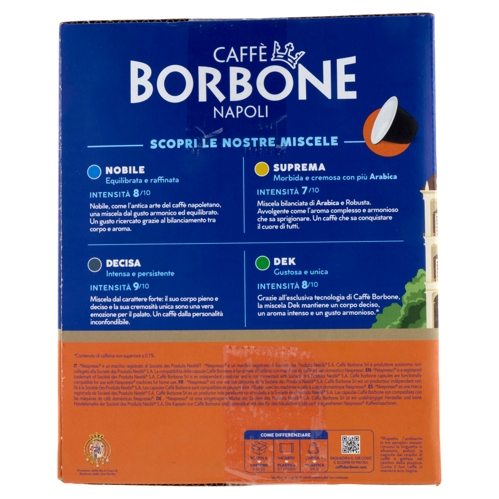 Caffè Borbone Napoli Caffè Borbone è un momento di puro gusto e sincerità che conquista tutti. Nel nostro caffè c'è tutta la cultura della tradizione napoletana, è un viaggio con la mente aperta al mondo. È una magia da condividere, che si ripete ad ogni tazzina. È un rito prezioso, un attimo vissuto pienamente. Confezioniamo ogni capsula singolarmente per preservare fragranza e aroma e garantire igiene e sicurezza. Questa è la nostra speciale ricetta, per avere sempre un caffè come appena tostato! Scopri le nostre miscele Nobile Equilibrata e raffinata Intensità 8/10 Nobile, come l'antica arte del caffè napoletano, una miscela dal gusto armonico ed equilibrato. Un gusto ricercato grazie al bilanciamento tra corpo e aroma. Suprema Morbida e cremosa, con più Arabica Intensità 7/10 Miscela bilanciata di Arabica e Robusta. Avvolgente come l'aroma complesso e armonioso che sa sprigionare. Un caffè che sa conquistare il cuore di tutti. Decisa Intensa e persistente Intensità 9/10 Miscela dal carattere forte: il suo corpo pieno e deciso e la sua cremosità unica sono una vera emozione per il palato. Un caffè dalla personalità inconfondibile. Dek Gustosa e unica Intensità 8/10 Grazie all'esclusiva tecnologia di Caffè Borbone, la miscela Dek mantiene un corpo deciso, un aroma intenso e un gusto armonioso.* *Contenuto di caffeina non superiore a 0.1%. Fornitore della Real Casa di Borbone delle due Sicilie Inquadra il qr code e scopri di più su: caffeborbone.com