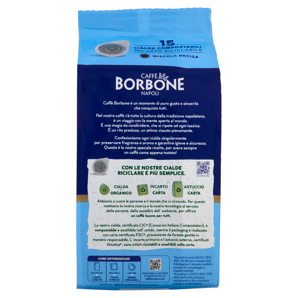 Caffè Borbone Napoli Caffè Borbone è un momento di puro gusto e sincerità che conquista tutti. Nel nostro caffè c'è tutta la cultura della tradizione napoletana, è un viaggio con la mente aperta al mondo. È una magia da condividere, che si ripete ad ogni tazzina. È un rito prezioso, un attimo vissuto pienamente. Confezioniamo ogni cialda singolarmente per preservare fragranza e aroma e garantire igiene e sicurezza. Questa è la nostra speciale ricetta, per avere sempre un caffè come appena tostato! Con le nostre cialde riciclare è più semplice. Cialda - Organico Incarto - Carta Astuccio - Carta Abbiamo a cuore le persone e il mondo che ci circonda. Per questo mettiamo la nostra ricerca e la nostra tecnologia al servizio delle persone, della società e dell'ambiente, per offrire un caffè buono per tutti. La nostra cialda, certificata CIC (Consorzio Italiano Compostatori), è compostabile e smaltibile nell'umido, mentre il packaging è realizzato con carta certificata FSC, proveniente da foreste gestite in maniera responsabile. L'incarto primario e l'astuccio esterno, certificati Aticelca, sono infatti riciclabili e smaltibili nella carta. Inquadra il QR code e scopri di più su: caffeborbone.com Fornitore della Real Casa di Borbone delle due Sicilie