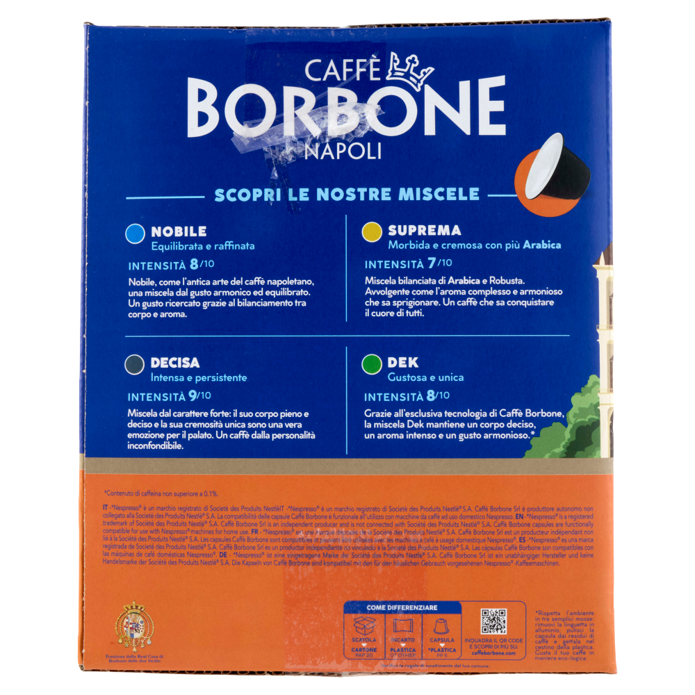 Caffè Borbone Napoli Caffè Borbone è un momento di puro gusto e sincerità che conquista tutti. Nel nostro caffè c'è tutta la cultura della tradizione napoletana, è un viaggio con la mente aperta al mondo. È una magia da condividere, che si ripete ad ogni tazzina. È un rito prezioso, un attimo vissuto pienamente. Confezioniamo ogni capsula singolarmente per preservare fragranza e aroma e garantire igiene e sicurezza. Questa è la nostra speciale ricetta, per avere sempre un caffè come appena tostato! Scopri le nostre miscele Nobile Equilibrata e raffinata Intensità 8/10 Nobile, come l'antica arte del caffè napoletano, una miscela dal gusto armonico ed equilibrato. Un gusto ricercato grazie al bilanciamento tra corpo e aroma. Suprema Morbida e cremosa, con più Arabica Intensità 7/10 Miscela bilanciata di Arabica e Robusta. Avvolgente come l'aroma complesso e armonioso che sa sprigionare. Un caffè che sa conquistare il cuore di tutti. Decisa Intensa e persistente Intensità 9/10 Miscela dal carattere forte: il suo corpo pieno e deciso e la sua cremosità unica sono una vera emozione per il palato. Un caffè dalla personalità inconfondibile. Dek Gustosa e unica Intensità 8/10 Grazie all'esclusiva tecnologia di Caffè Borbone, la miscela Dek mantiene un corpo deciso, un aroma intenso e un gusto armonioso.* *Contenuto di caffeina non superiore a 0.1%. Fornitore della Real Casa di Borbone delle due Sicilie Inquadra il qr code e scopri di più su: caffeborbone.com
