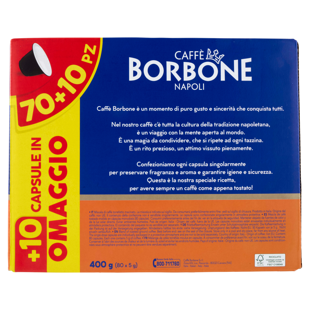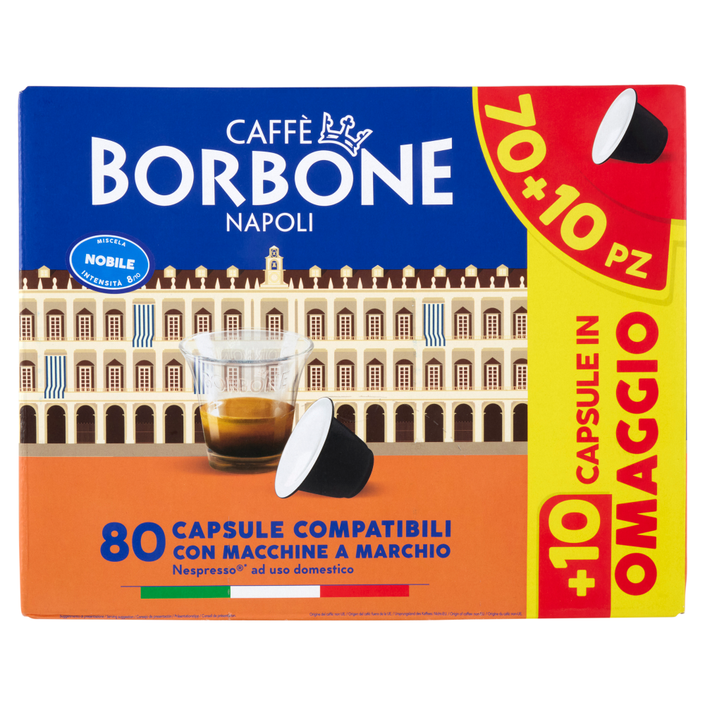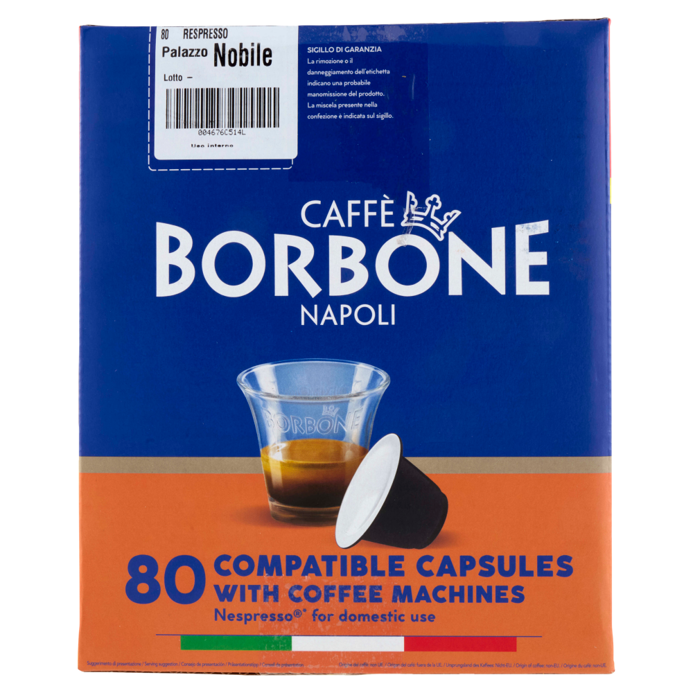 80 Capsule Compatibili con Macchine a Marchio Nespresso* ad uso domestico *Nespresso è un marchio registrato di Societè des Produits Nestlè S.A.. Caffè Borbone Srl è produttore autonomo non collegato alla Societè des Produits Nestlè S.A.. La compatibilità delle capsule Caffè Borbone è funzionale all'utilizzo con macchine da caffè ad uso domestico Nespresso.