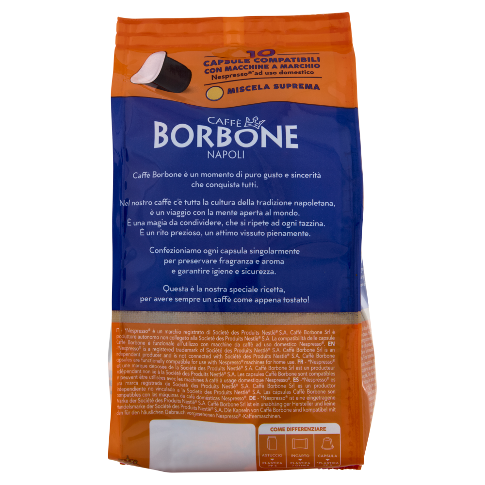 *Nespresso è un marchio registrato di Societè des Produits Nestlè S.A. Caffè Borbone Srl è produttore autonomo non collegato alla Societè des Produits Nestlè S.A. La compatibilità delle capsule Caffè Borbone è funzionale all'utilizzo con macchine da caffè ad uso domestico Nespresso. Il contenuto della confezione non è vendibile singolarmente.