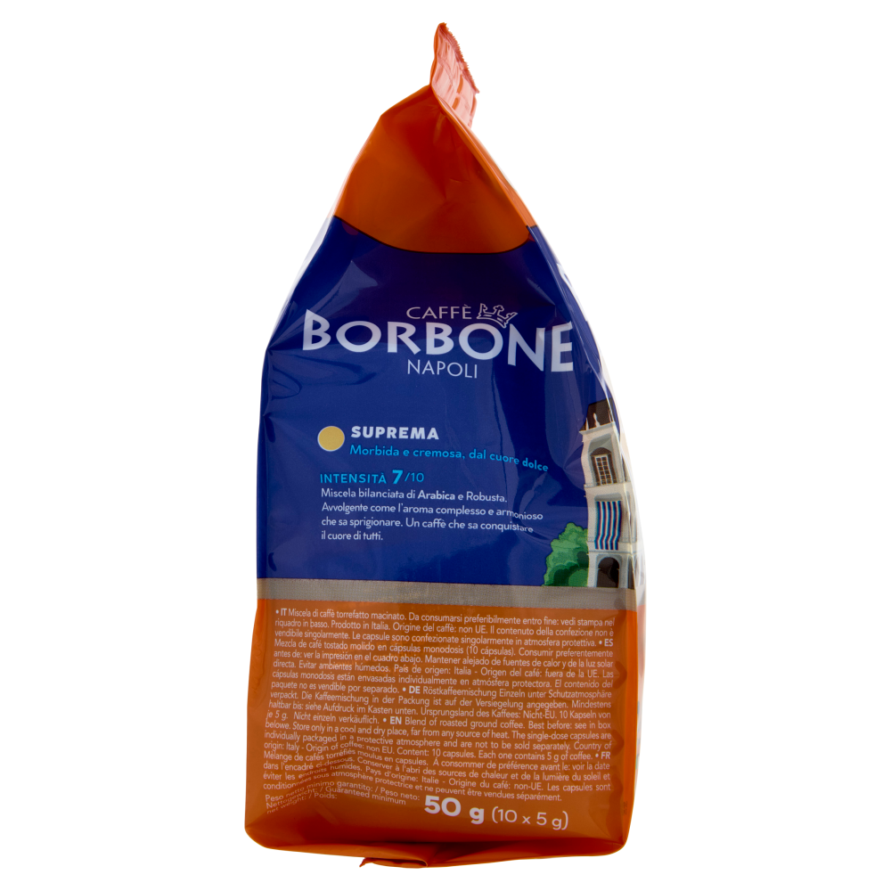 Caffè Borbone Napoli Caffè Borbone è un momento di puro gusto e sincerità che conquista tutti. Nel nostro caffè c'è tutta la cultura della tradizione napoletana, è un viaggio con la mente aperta al mondo. È una magia da condividere, che si ripete ad ogni tazzina. È un rito prezioso, un attimo vissuto pienamente. Confezioniamo ogni capsula singolarmente per preservare fragranza e aroma e garantire igiene e sicurezza. Questa è la nostra speciale ricetta, per avere sempre un caffè come appena tostato! Fornitore della Real Casa di Borbone delle due Sicilie Suprema Morbida e cremosa, dal cuore dolce Intensità 7/10 Miscela bilanciata di Arabica e Robusta. Avvolgente come l'aroma complesso e armonioso che sa sprigionare. Un caffè che sa conquistare il cuore di tutti. Inquadra il qr code e scopri di più su: caffeborbone.com