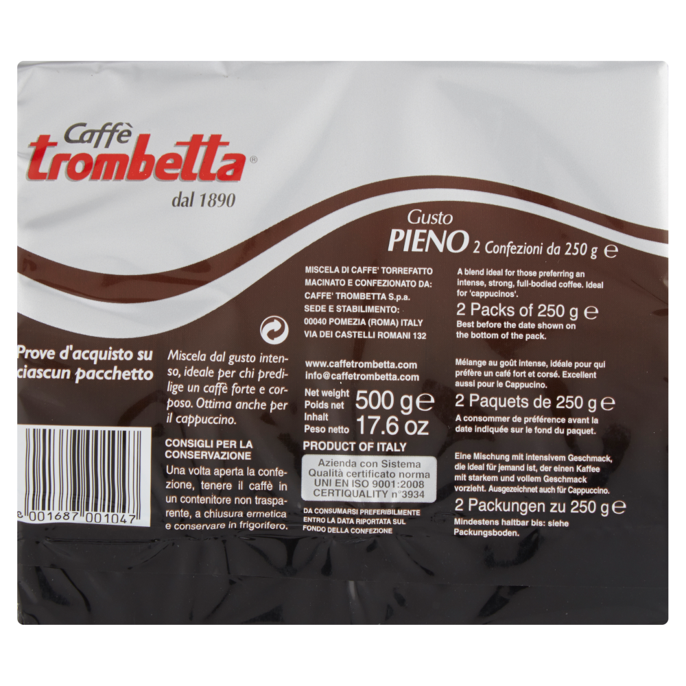 Miscela di caffè torrefatto macinato e confezionato da: Caffè Trombetta S.p.a. Sede e stabilimento: 00040 Pomezia (Roma) Italy Via dei Castelli Romani 132