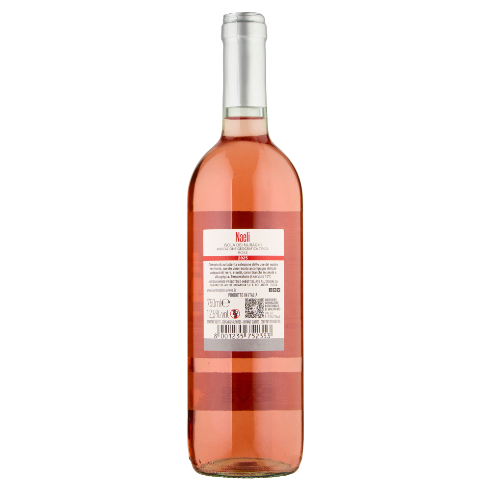 Naeli Isola dei Nuraghi IGT Rosé, vino rosé italiano. Ottenuto da un'attenta selezione delle uve del nostro territorio, questo vino rosato accompagna delicati antipasti di terra, risotti, carni bianche in umido o alla griglia. Isola dei Nuraghi Indicazione Geografica Tipica