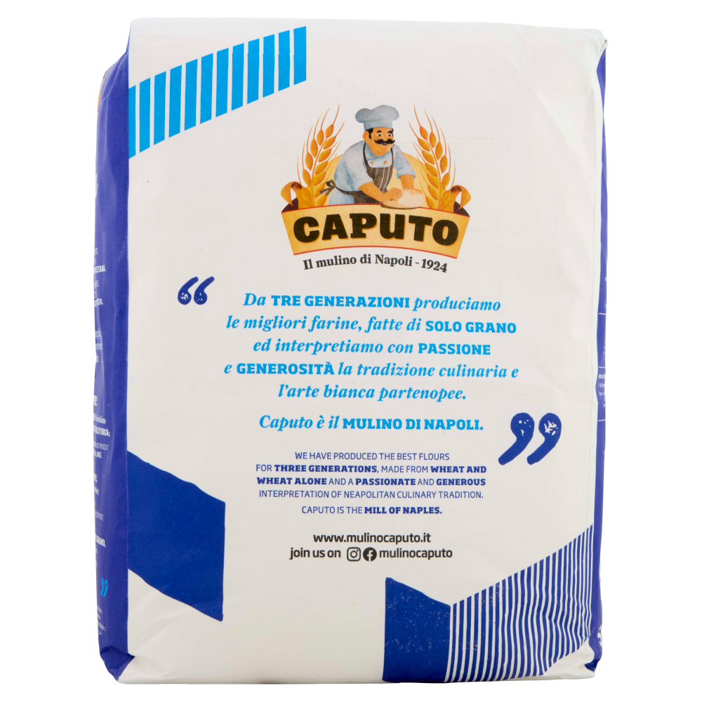 Caputo Il mulino di Napoli - 1924 "Da Tre Generazioni produciamo le migliori farine, fatte di Solo Grano ed interpretiamo con Passione e Generosità la tradizione culinaria e l'arte bianca partenopee. Caputo è il Mulino di Napoli" www.mulinocaputo.it Seguici su Instagram, Facebook mulinocaputo "Da Sempre: Selezioniamo i Grani Migliori e li misceliamo secondo i principi dell'Antica Arte Molitoria; Li Maciniamo Lentamente, per non danneggiare amidi e proteine; Utilizziamo Solo ed Esclusivamente Grano, senza l'aggiunta di alcun additivo."