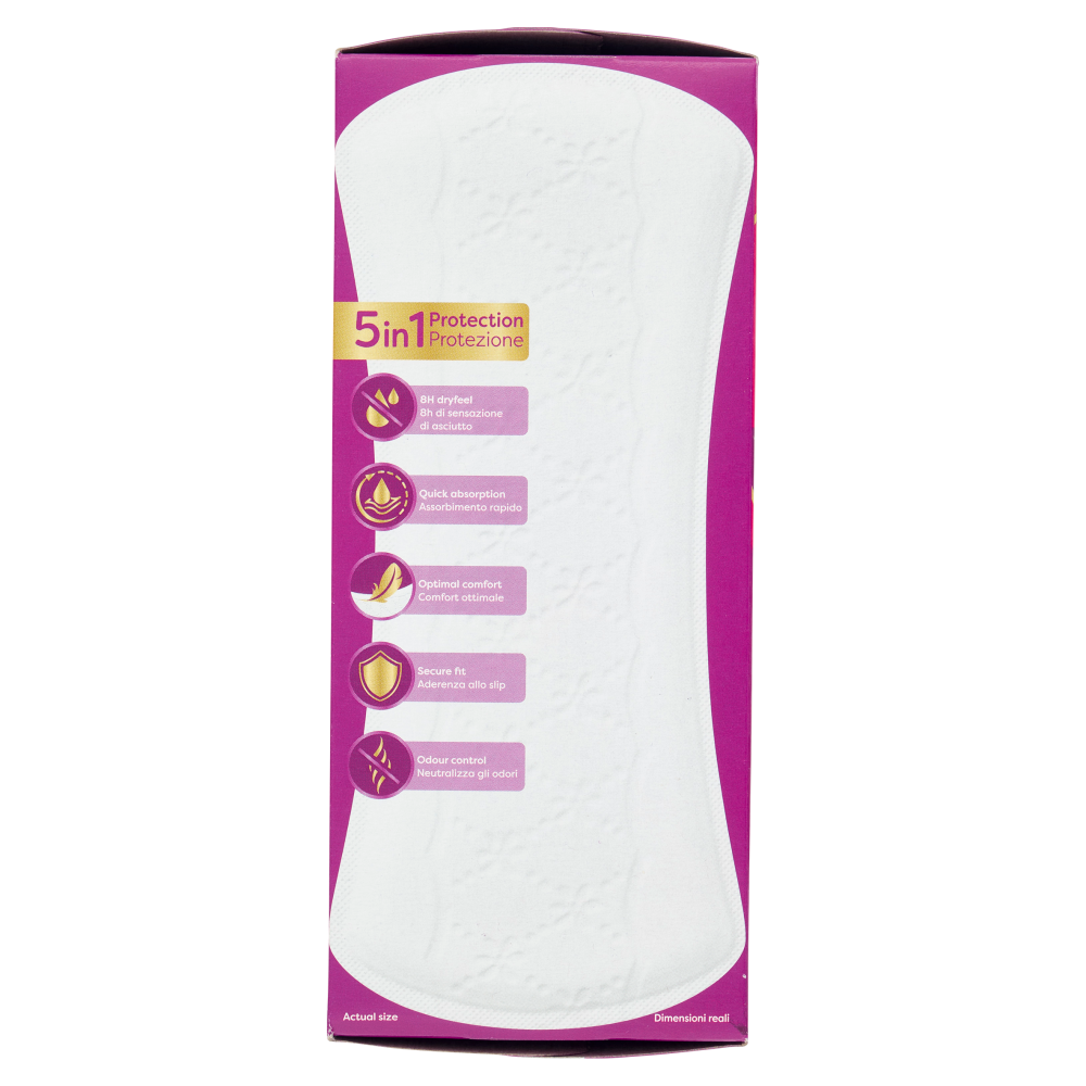8h di sensazione di asciutto: pelle asciutta tutto il giorno Assorbimento rapido: il nucleo super assorbente aiuta a trattenere immediatamente l'umidità Ottimo comfort grazie al rivestimento soffice al tatto Rimane saldamente in posizione Neutralizza gli odori: assicura il controllo degli odori e una duratura sensazione di freschezza Il cartone è riciclabile. La confezione è realizzata con materiali certificati FSC e altri materiali controllati Rivestimento dermatologicamente testato 0% coloranti & sbiancamento al cloro elementare 5 in 1 Protezione 8h di sensazione di asciutto Assorbimento rapido Comfort ottimale Aderenza allo slip Neutralizza gli odori