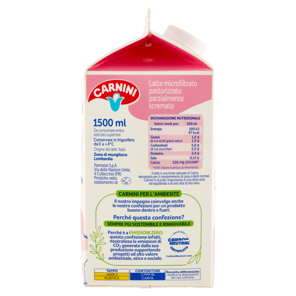Il latte è una fonte naturale di Calcio necessario per il mantenimento di ossa e denti normali. Carnini ti ricorda l'importanza di una dieta varia ed equilibrata e uno stile di vita sano. Carnini per l'ambiente Il nostro impegno coinvolge anche le nostre confezioni per un prodotto buono dentro e fuori. Perché questa confezione? Sempre più sostenibile e rinnovabile Perché è a Emissioni Zero: questa confezione infatti, neutralizza le emissioni di CO₂ generate dalla sua produzione supportando progetti ad alto valore ambientale, etico e sociale.