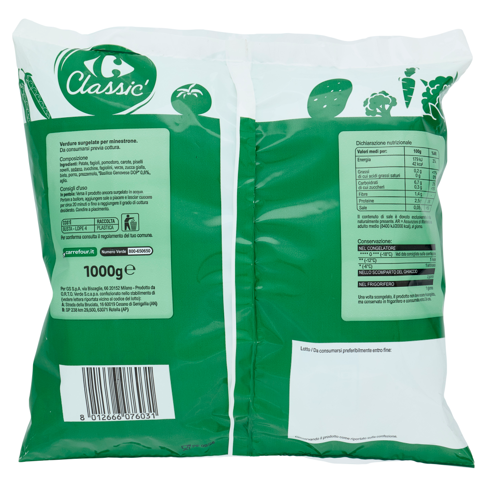 Per GS S.p.A. via Bisceglie, 66 20152 Milano Prodotto da O.R.T.O. Verde S.c.a.p.a. confezionato nello stabilimento di (vedere lettera riportata vicino al codice del lotto): A: Strada della Bruciata, 16 60019 Cesano di Senigallia (AN) B: SP 238 km 29,500, 63071 Rotella (AP)