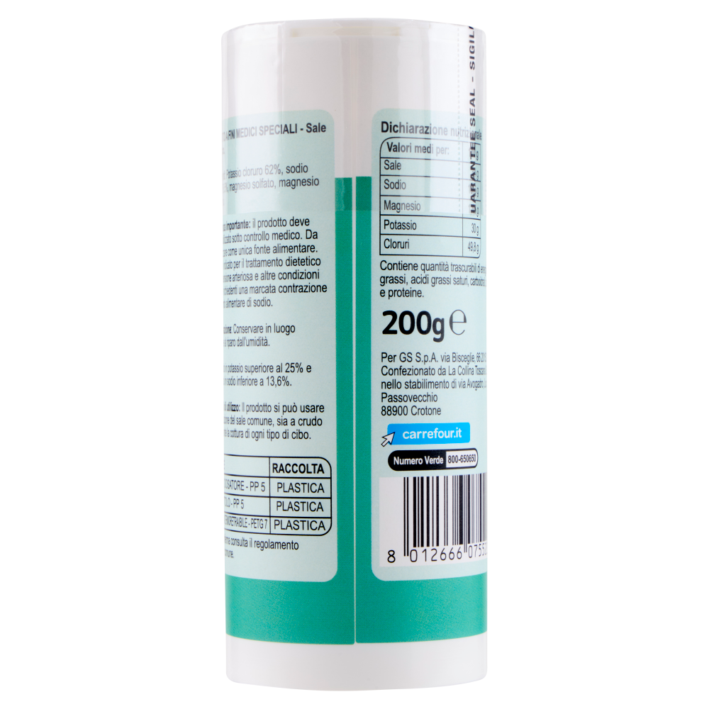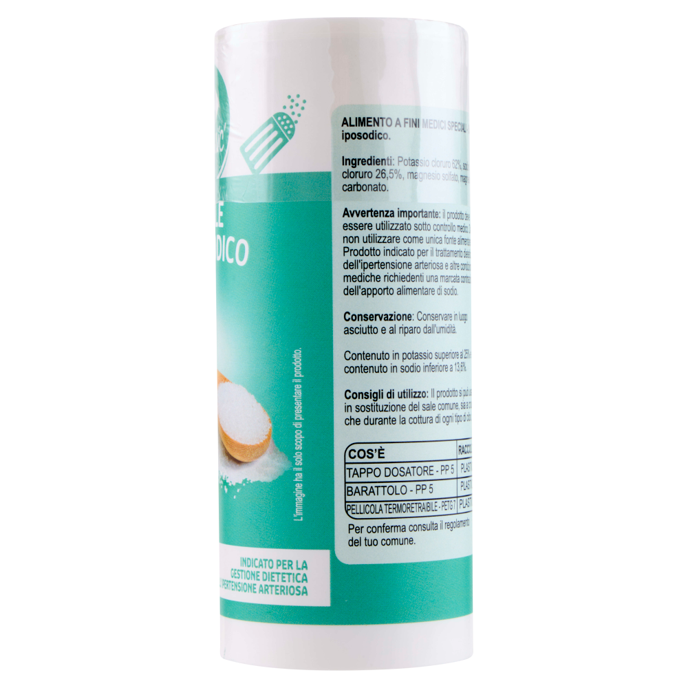 Avvertenza importante: il prodotto deve essere utilizzato sotto controllo medico. Da non utilizzare come unica fonte alimentare. Prodotto indicato per il trattamento dietetico dell'ipertensione arteriosa e altre condizioni mediche richiedenti una marcata contrazione dell'apporto alimentare di sodio.