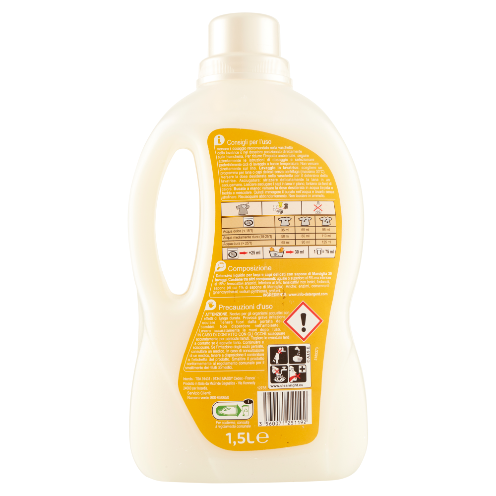 Consigli per l'uso Versare il dosaggio raccomandato nella vaschetta della lavatrice o nel dosatore posizionato direttamente sulla biancheria. Per ridurre l'impatto ambientale, seguire attentamente le istruzioni di dosaggio e selezionare preferibilmente cicli di lavaggio a basse temperature. Non versare direttamente sul lino. Lavaggio in lavatrice: scegliere un programma per lana o capi delicati senza centrifuga (massimo 30°C). Versare la dose desiderata nella vaschetta per il detersivo della lavatrice. Asciugatura: strizzare delicatamente la lana in un asciugamano. Lasciare asciugare i capi in lana in piano, lontano da fonti di calore. Bucato a mano: versare la dose desiderata in acqua tiepida o fredda e mescolare. Quindi immergere il bucato nell'acqua e lavarlo senza strofinare. Risciacquare abbondantemente. Non lasciare in ammollo. In lavatrice 2,5 kg Acqua dolce (< 15°f) | Poco sporco: 35 ml | Sporco normale: 65 ml | Molto sporco: 95 ml Acqua mediamente dura (15-25°f) | Poco sporco: 50 ml | Sporco normale: 80 ml | Molto sporco: 110 ml Acqua dura (> 25°f) | Poco sporco: 65 ml | Sporco normale: 95 ml | Molto sporco: 125 ml In lavatrice 7 kg | +25 ml A mano 10 L | 30 ml 1 Tappo = 75 ml