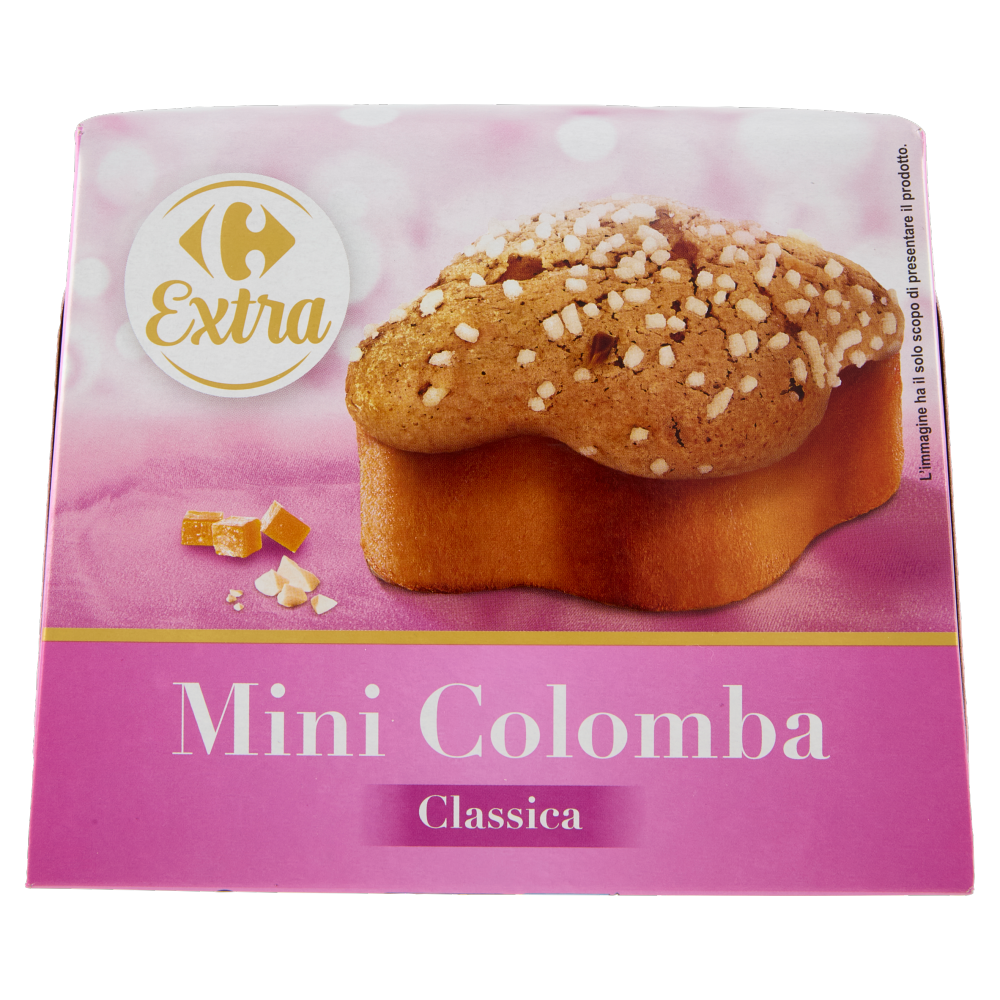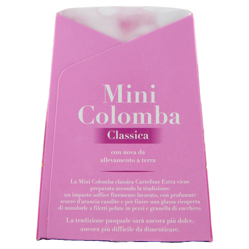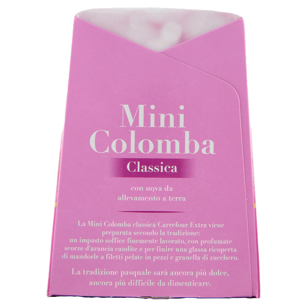 con uova da allevamento a terra La Mini Colomba classica Carrefour Extra viene preparata secondo la tradizione: un impasto soffice finemente lavorato, con profumate scorze d'arancia candite e per finire una glassa ricoperta di mandorle a filetti pelate in pezzi e granella di zucchero. La tradizione pasquale sarà ancora più dolce, ancora più difficile da dimenticare.