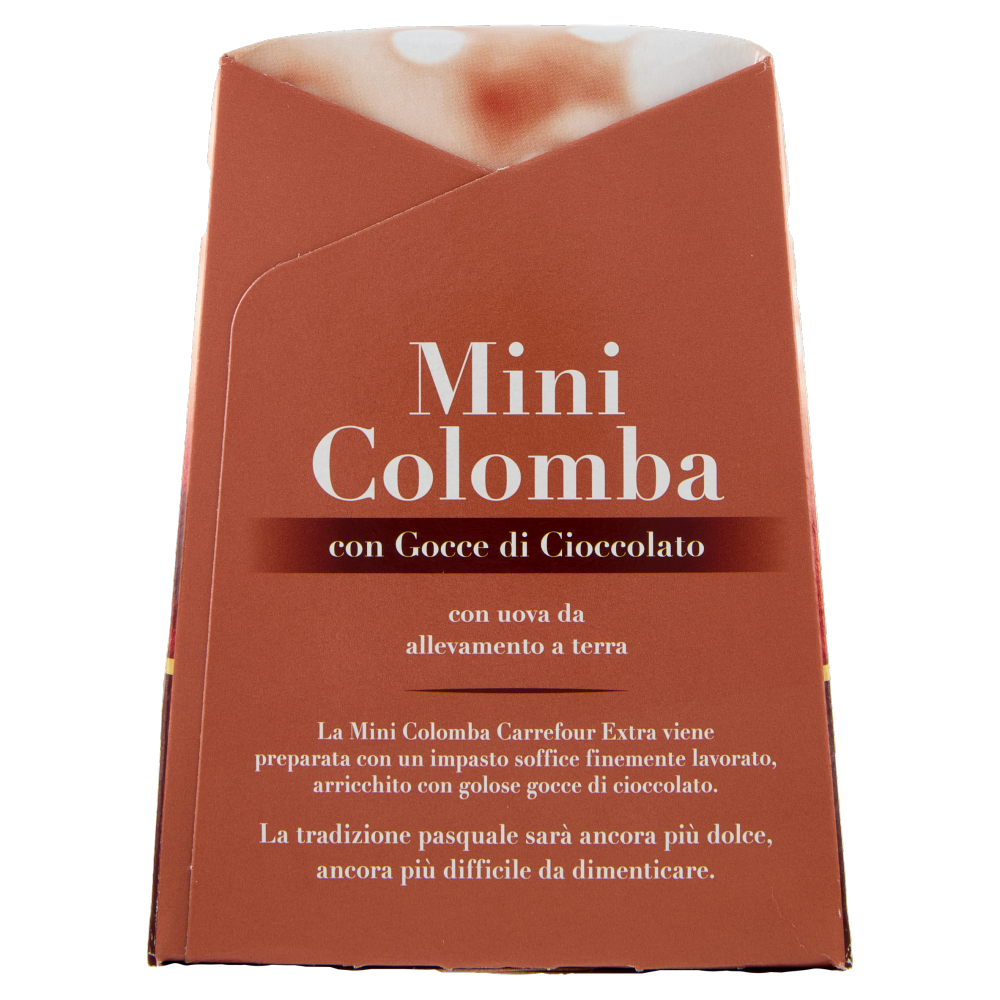 con uova da allevamento a terra La Mini Colomba Carrefour Extra viene preparata con un impasto soffice finemente lavorato, arricchito con golose gocce di cioccolato. La tradizione pasquale sarà ancora più dolce, ancora più difficile da dimenticare.