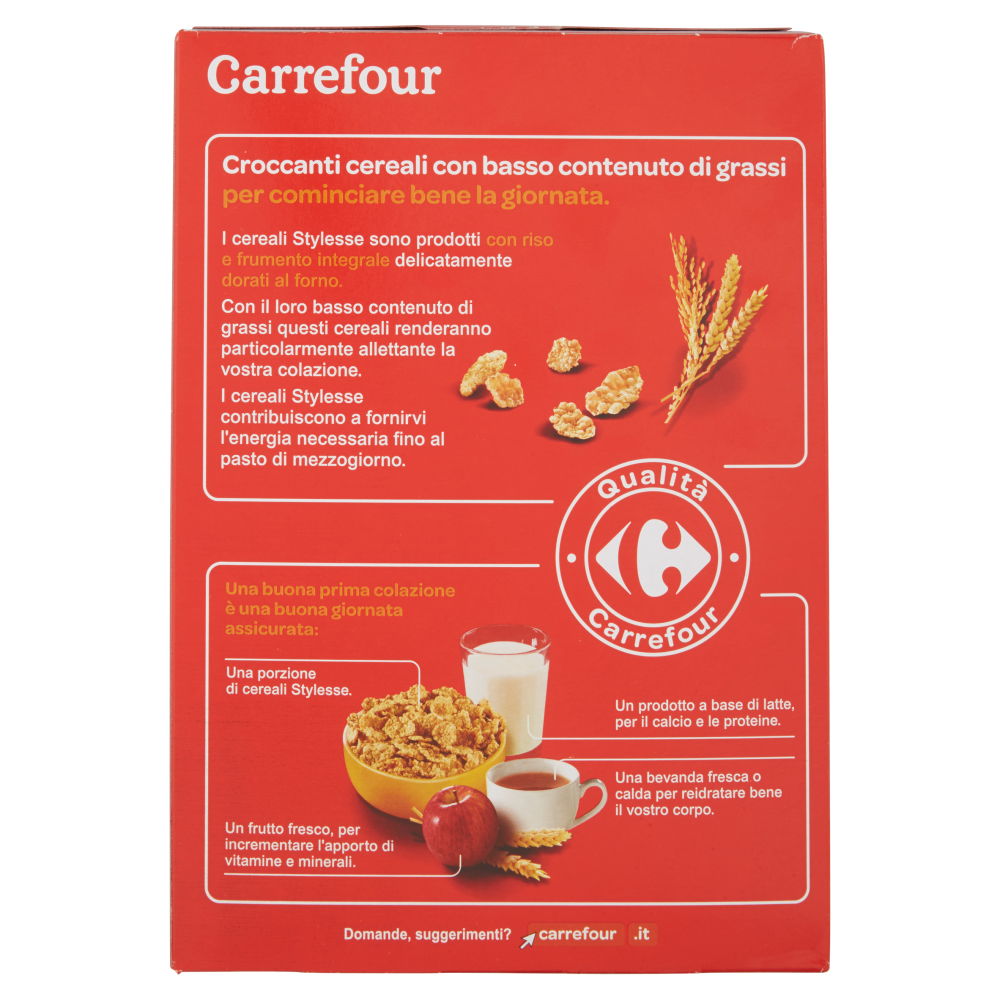 Croccanti cereali con basso contenuto di grassi per cominciare bene la giornata. I cereali Stylesse sono prodotti con riso e frumento integrale delicatamente dorati al forno. Con il loro basso contenuto di grassi questi cereali renderanno particolarmente allettante la vostra colazione. I cereali Stylesse contribuiscono a fornirvi l'energia necessaria fino al pasto di mezzogiorno. Una buona prima colazione è una buona giornata assicurata: Una porzione di cereali Stylesse. Un prodotto a base di latte, per il calcio e le proteine. Una bevanda fresca o calda per reidratare bene il vostro corpo. Un frutto fresco, per incrementare l'apporto di vitamine e minerali.