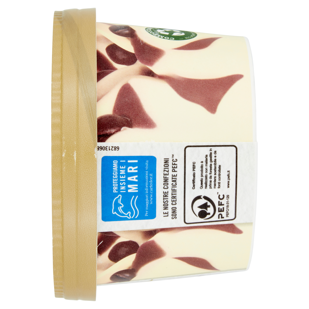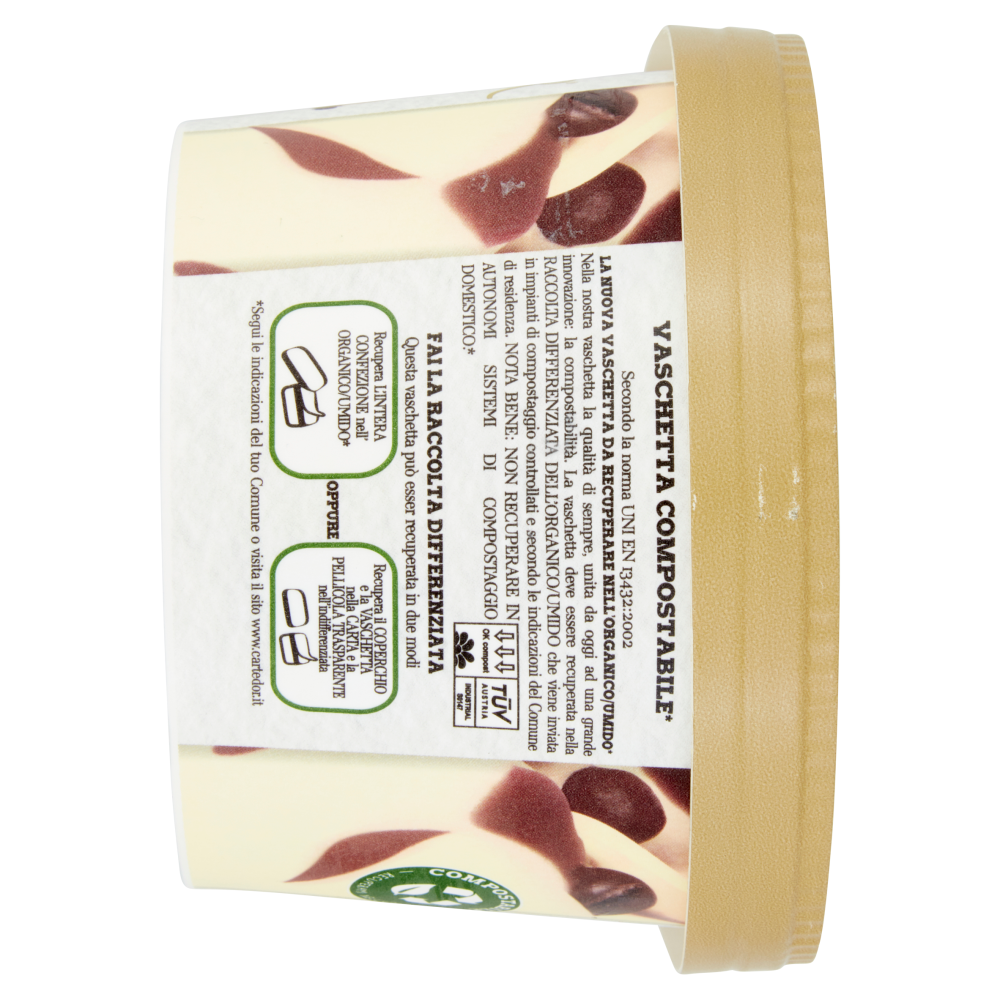 Senza glutineGelato alla vaniglia con variegatura al caffè (24%) e grani di cioccolato al caffè (3%)