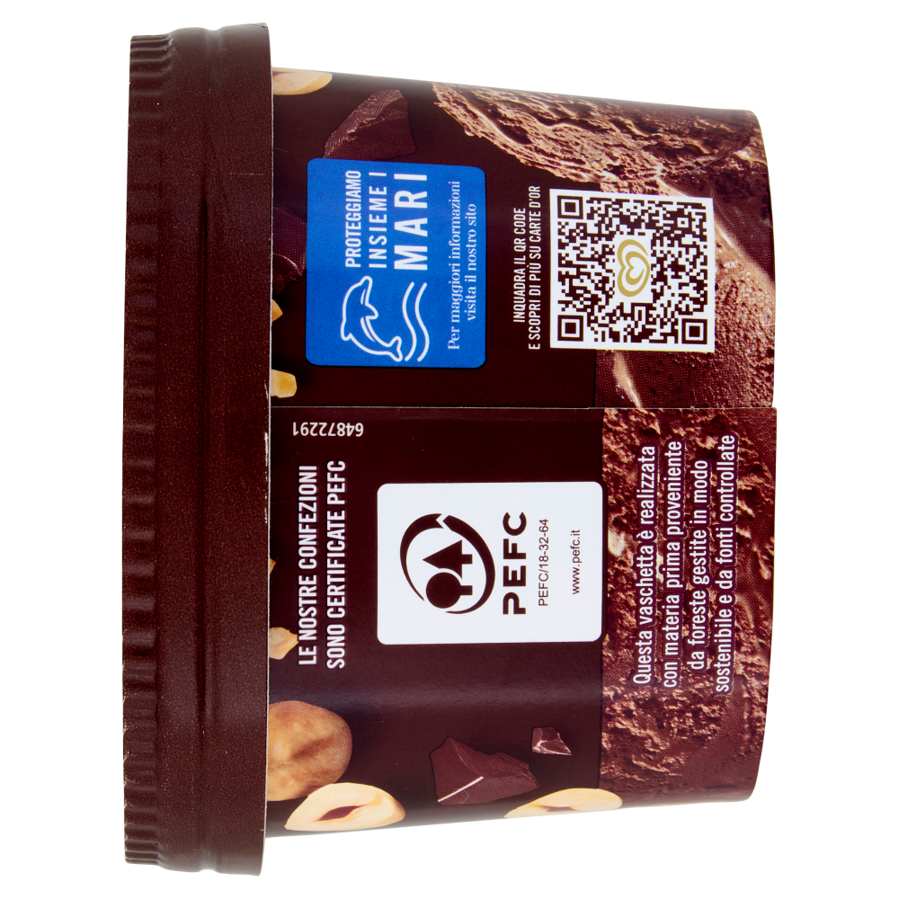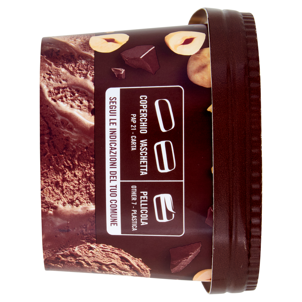 Gelato al cacao magro con variegatura all'uovo (11%), granella di nocciole tostate (2,5%) e pezzetti di cioccolato (2,5%)
