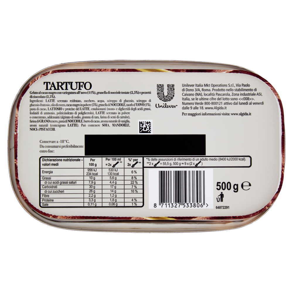 Unilever Italia Mkt Operations S.r.l. Via Paolo di Dono 3/A Roma Prodotto nello stabilimento di Caivano (NA) località Pascarola Zona industriale ASI Italia se le ultime cifre del lotto sono <<008>>